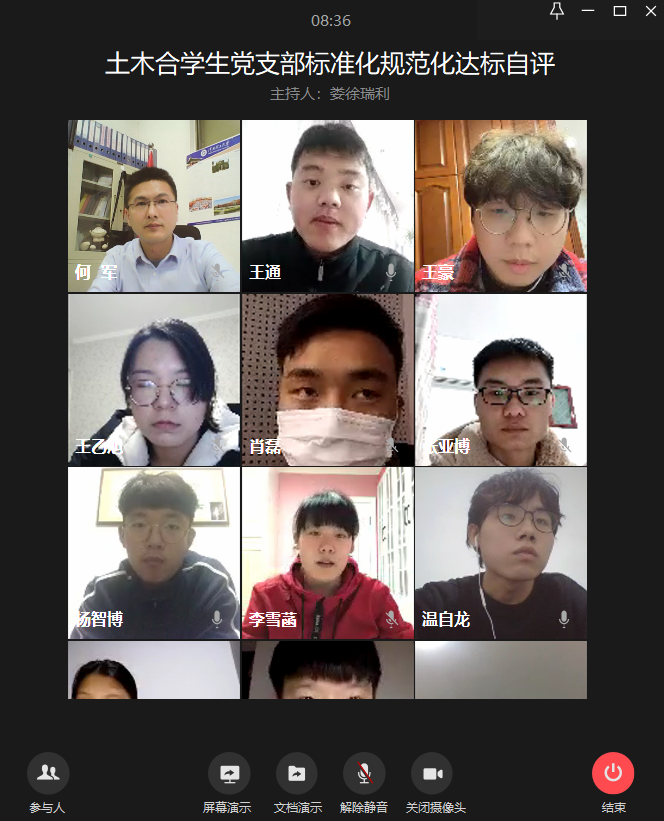我院土木合学生党支部自《河南理工大学党支部建设“两化一创”强基引领三年行动计划(2019-2021)实施方案》印发以来,以习近平新时代中国特色社会主义思想为指导,着眼于培养德智体美劳全面发展的社会主义建设者和接班人,不断加强党支部标准化、规范化建设,提高建设质量,切实发挥战斗堡垒作用。近日,学校下发《关于开展基层党支部“两化一创”达标引领行动验收工作的通知》,土木合学生党支部严格对标对表,4月1日晚通过企业微信视频会议形式召开党员大会,回顾总结工作,对照“三标准三规范”的支部设置标准化、工作保障标准化、活动阵地标准化和制度机制规范化、组织生活规范化、党员教育管理规范化具体指标,不掩饰问题、不放大不足,认真商榷,如实填写《党支部标准化规范化达标自评表》,自查自评的同时,支部成员对照教育部《新时代高校党建“双创”工作重点任务指南(基层党支部)》和《河南理工大学样板支部标准》,进一步细化支部建设“任务表”,争取早日实现党支部政治建设全面加强、组织设置规范合理、支委班子坚强有力、运行机制顺畅高效、组织生活严肃规范、党员教育管理严格有效、党建工作保障切实有力的目标。