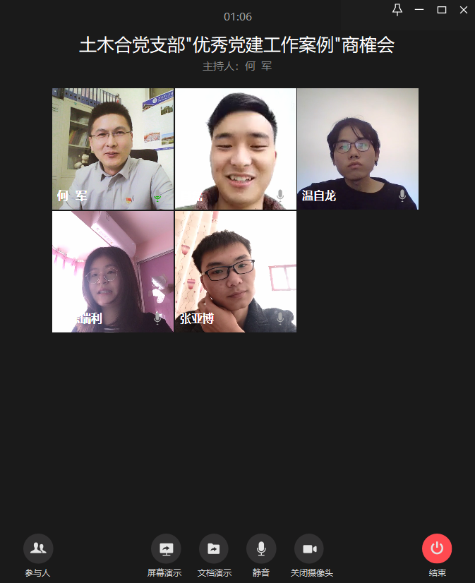 4月6日下午,我院土木合学生党支部召开“优秀党建工作案例”商榷会,总结举措、做法,凝练支部党建工作“shi”经验,会议由支部书记何军主持,肖磊、娄徐瑞利等5名支部骨干成员参加。