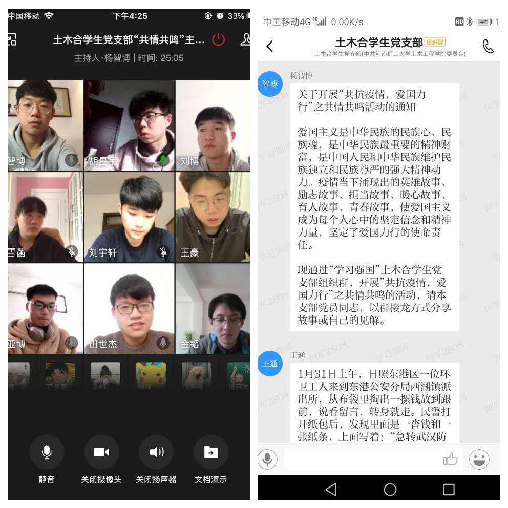 4月7日下午,土木合学生党支部联合土木合专业团支部,同心同向同行,分别依托企业微信、学习强国网络平台,开展“共抗疫情,爱国力行”之共情共鸣主题教育,20名党员、团员共同颂扬先进典型、分享抗疫故事。
