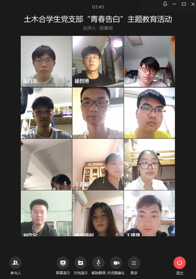6月2日下午,我院土木合学生党支部利用线上新媒体平台,开展“共抗疫情,爱国力行”之青春告白主题教育,支部全体党员同志、部分土木合专业学生参加了此次活动。