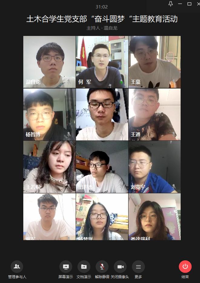 6月16日下午,土木合学生党支部依托企业微信网络平台开展“共抗疫情,爱国力行”之奋斗圆梦主题教育,支部成员逐人汇报本学期的学习、工作和生活情况,支委会成员对支部上半年工作进行全面总结,支部全体党员参加。