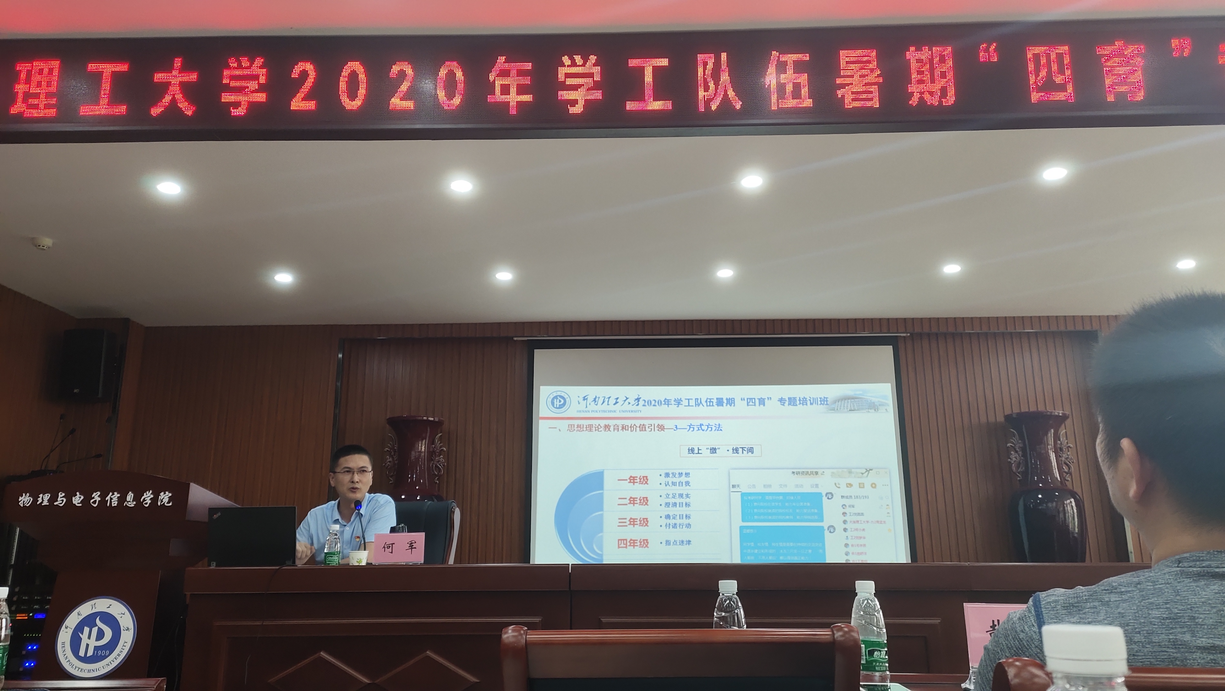 为加强辅导员队伍建设,进一步提升辅导员队伍专业素养和育人能力,8月10日-11日,学校举办2020年学工队伍暑期“四育”专题培训班,我院何军老师应邀作《新时代高校辅导员的专业成长与工作艺术》专题分享。