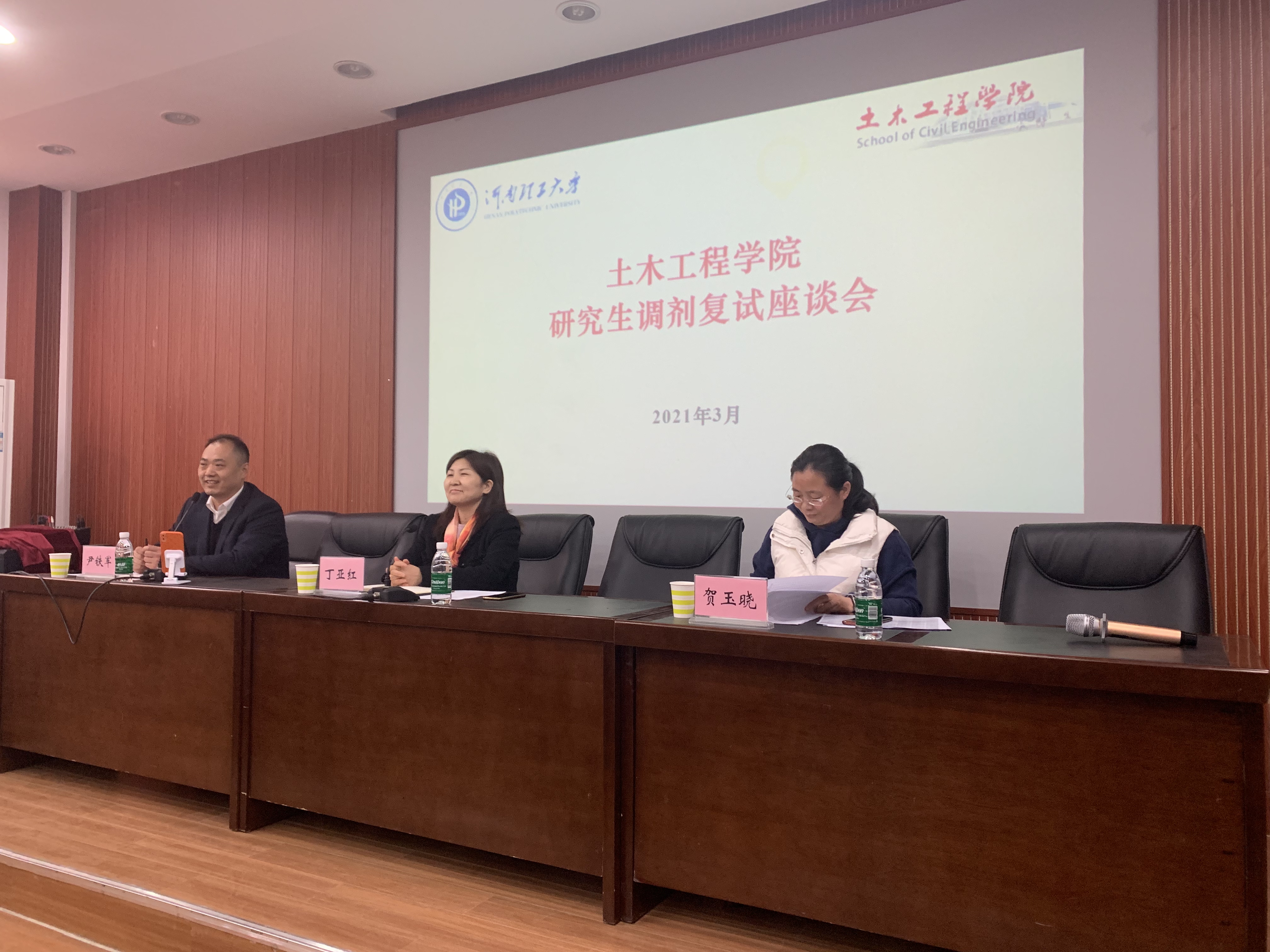 会议伊始,贺玉晓为考生详细讲解了关于考研复试、调剂的最新政策及信息,特别强调了今年调剂过程中不同于往年的新标准和新要求,其中涉及复试流程、调剂时间和优惠政策等。同时她结合我校往年考研的具体情况和疫情期间的相关要求,告知考生有关线上复试必要的准备,并针对考生存在的疑问逐一耐心解答;随后,丁亚红对考生提出了三点希望,一是复试过程中充满自信,在巩固自己的实践能力的前提下,充分展现理工土木人吃苦耐劳的品质;二是高度重视自身综合素养,在取得笔试高分的基础上,更要明确自己的考研目的和研究方向,形成完整的研究生生涯规划;三是切勿好高骛远,即便考上研究生,也应当注重本科阶段的毕业设计和毕业论文,为自己的本科学习画上完美的句号,进而更好地投入下一阶段的学习;最后,尹铁军对座谈会做出总结,与会领导老师也对考生送出了祝福。