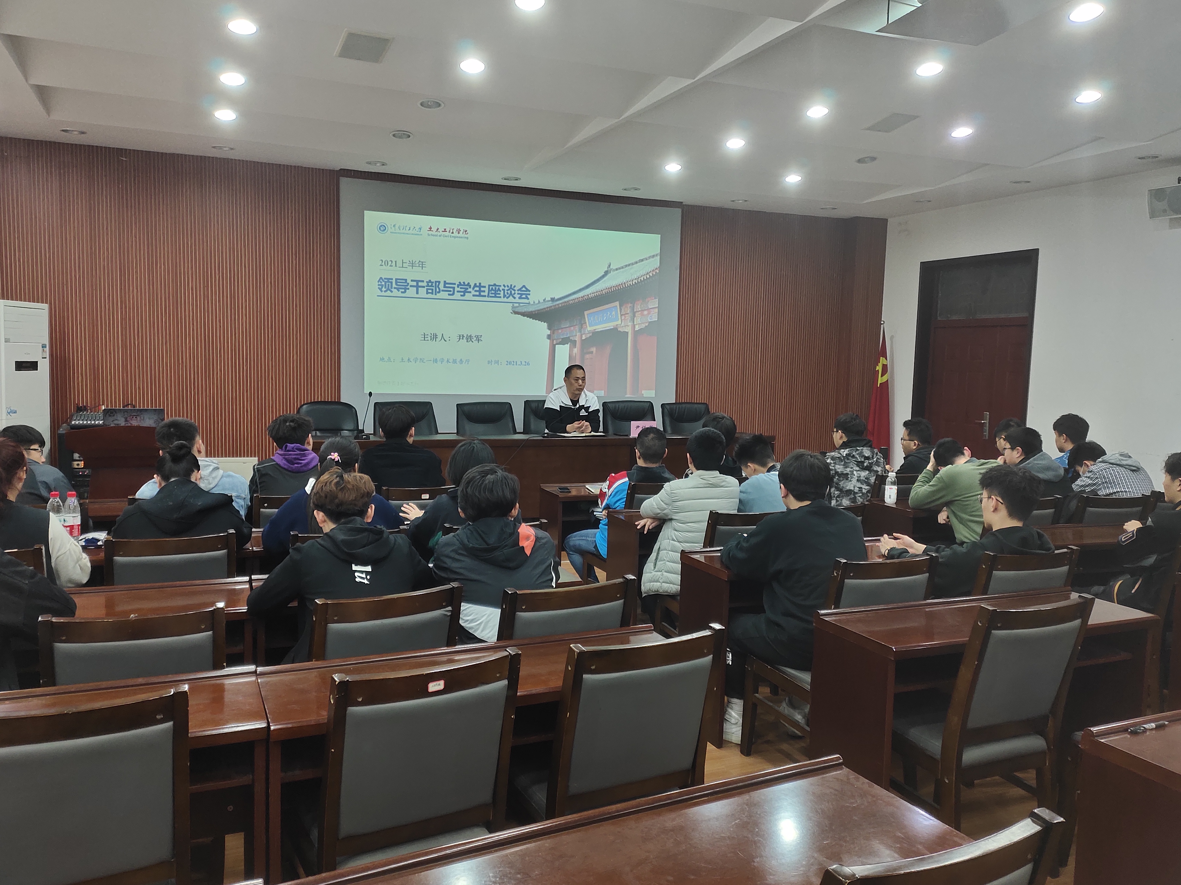 为增强思想政治教育工作的亲和力和针对性,3月26日下午,我院党委副书记尹铁军在学术报告厅与土木合2019-1班学生面对面交流,座谈会由“结‘网’授渔”育人工作室副主任尹香琰主持。