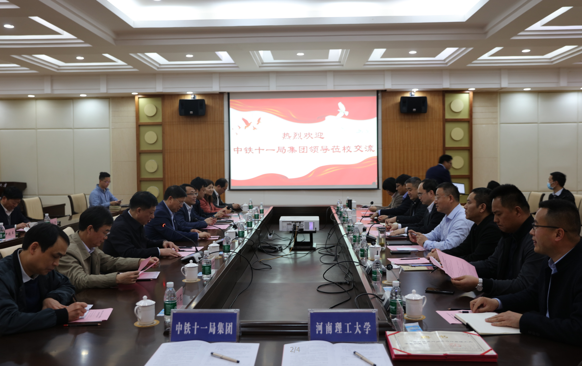 4月14日,我校与中铁十一局集团签署校企合作框架协议,就校企双方在人才培养、科学研究、资源共享、成果转化等方面的合作进行交流,中铁十一局人力资源部、中原指挥部、一公司等相关负责人,我校校友与社会合作办公室、校办、土木学院、测绘学院、安全学院等相关负责人参加了本次活动,会议由校友与社会合作办公室主任邵强主持。