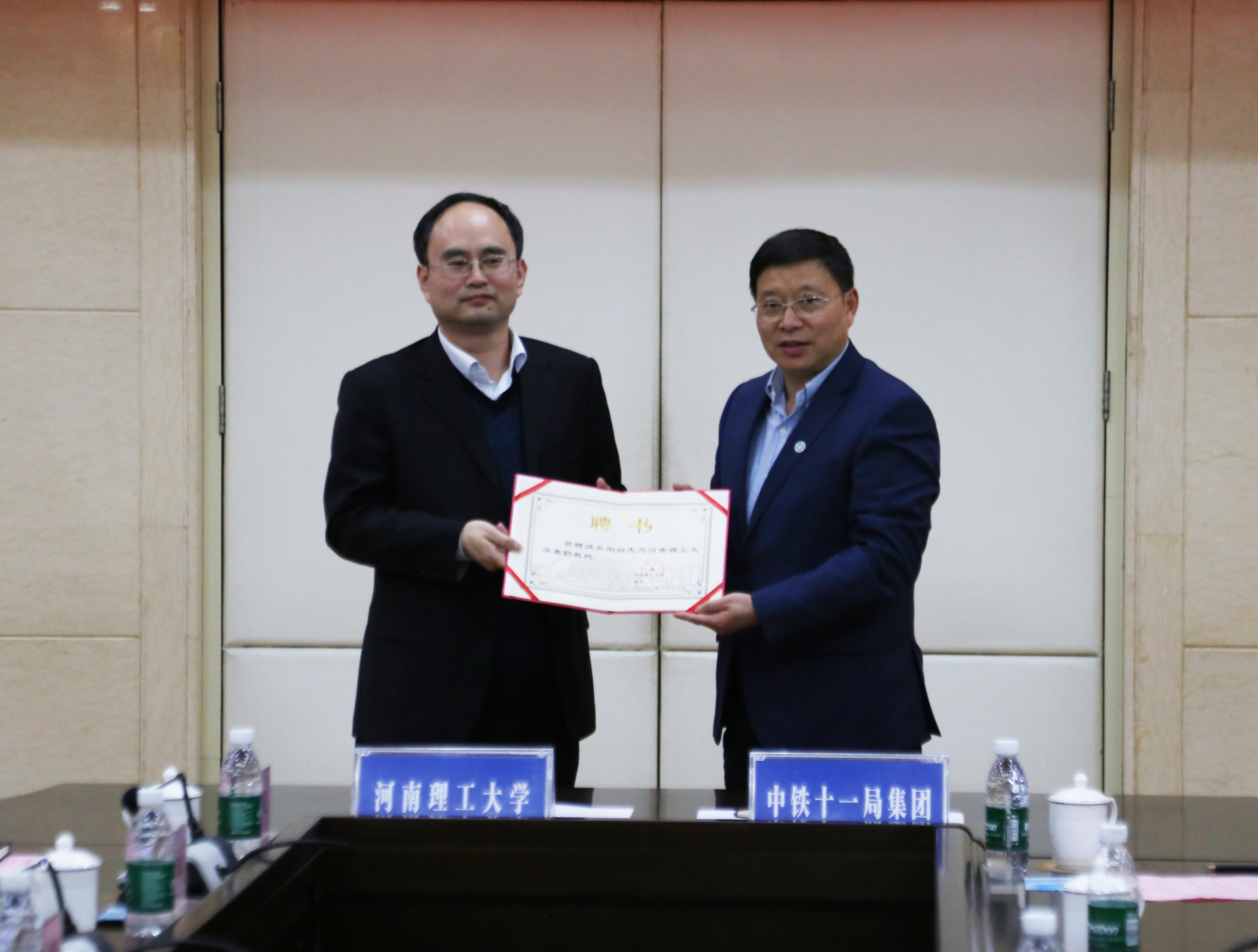 杨小林代表学校为中铁十一局集团副总经理吴刚等颁发兼职教授聘书,介绍了学校在新时期、新阶段的发展思路,重点推介了与中铁系统相关联的土木、安全、测绘等相关专业的人才培养和科学研究特色,建议联合申报现代产业学院,进一步深化产学研全方位合作。沈记全代表学校致辞,介绍了学校112年发展历程以及学科建设、人才培养和科研平台等基本情况。吴刚对河南理工大学为中铁十一局集团在人才输送、企业发展等方面给予的支持表示感谢,并从发展历程、企业现状等方面介绍了中铁十一局集团的基本情况,提出“共建”、“共赢”、“共创”三点建议,希望双方在人才培养的基础上进一步深化合作,共同开展项目申报、科技攻关和成果转化,实现共赢发展。