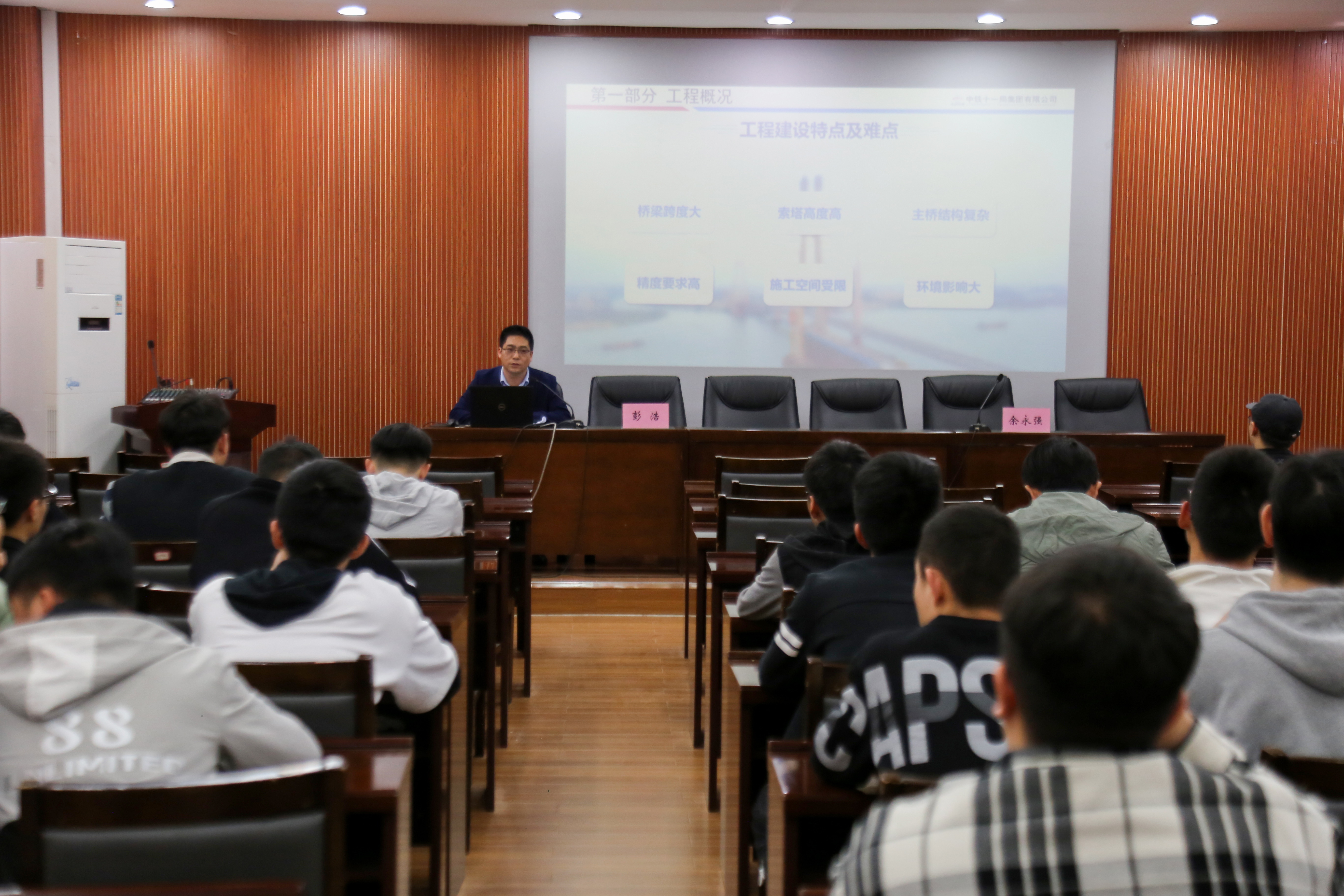 座谈结束后,沈记全和吴刚代表双方单位在校企合作框架协议书上签字,并合影留念。随后,吴刚一行专程到访我院与各系室教师进行深入交流,洽谈合作事宜。中铁十一局集团南玉铁路项目部总工程师彭浩为我院师生带来题为《深水大跨度铁路斜拉桥施工关键技术》的专题学术报告。