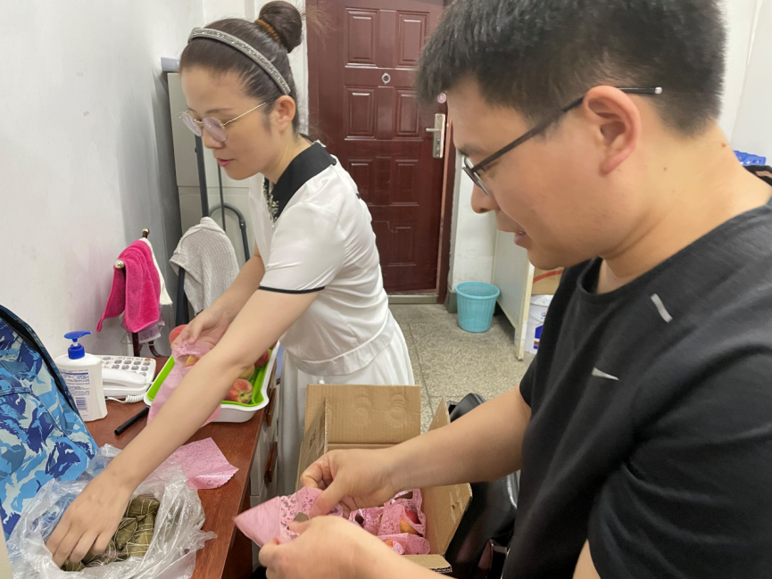 6月11日上午三号教学楼3501教室,力学2020级班主任蔺海晓、王文贞为同学们准备了“端午特别礼物”—爱心香粽、甜蜜桃子以及冰凉雪糕。丝丝缕缕的粽香、盈盈欲滴的桃汁、清新凉爽的雪糕,使大家沉浸在一片欢声笑语之中。“今年收到了端午礼物,也是意外的惊喜,这次不再是别人家的班主任!”学生在领取粽子等礼物之后兴奋地说道。礼物的背后蕴含着两位老师的深深祝福,希望学生们在学校也能体会到粽香温情,生活能像桃子一样甜蜜,遇事能像雪糕一样冷静沉着。