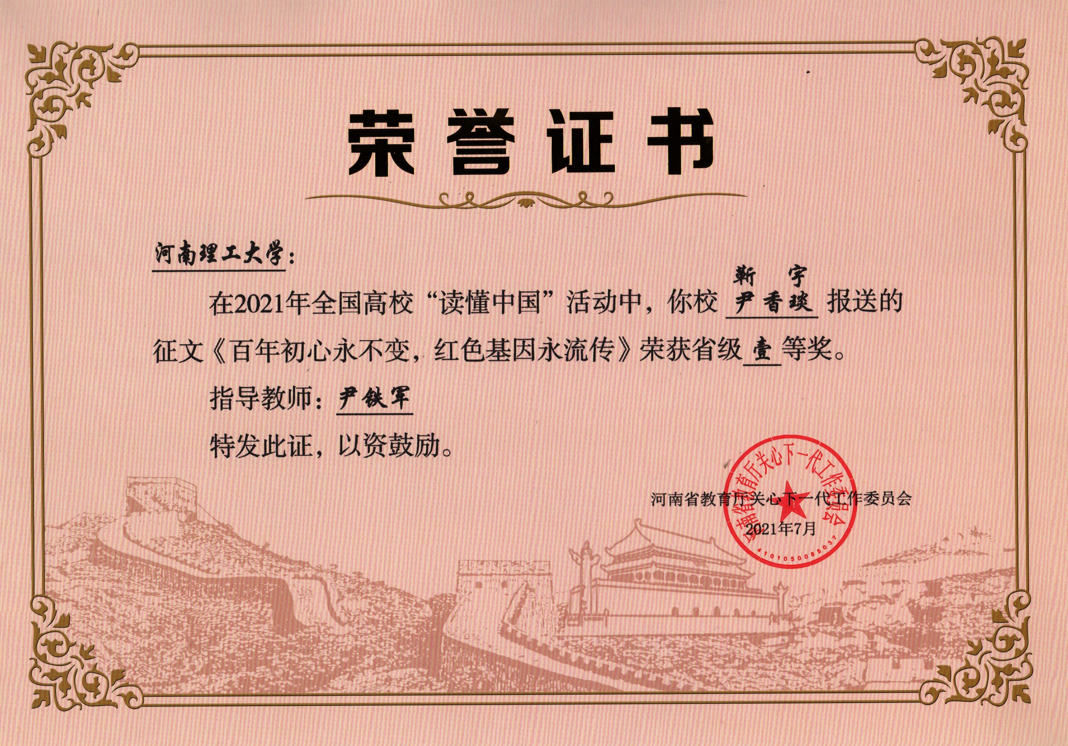 任重道远,百年恰是风华正茂;踔厉奋发,千秋亦蕴深邃磅礴。为深入学习贯彻习近平总书记对关心下一代工作的重要指示精神,全面落实《新时代爱国主义教育实施纲要》,迎接庆祝建党100周年,教育部关工委开展全国高校“读懂中国”活动。在此次活动中,由我院党委副书记尹铁军指导,2018级学生尹香琰、2019级学生靳宇撰写的征文《百年初心永不变,红色基因永流传》荣获省级一等奖。