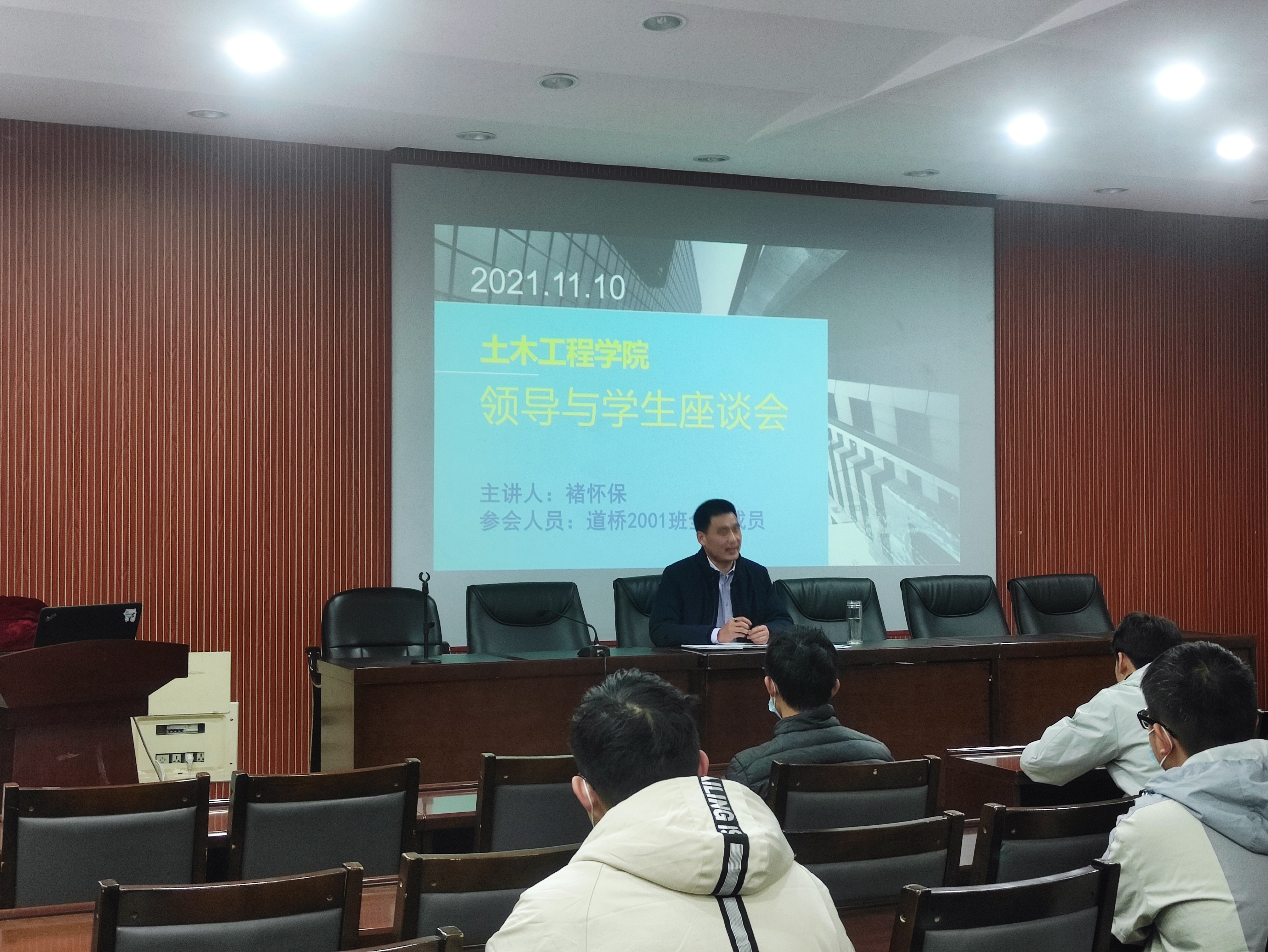 为深入了解学生的学习和生活,加强领导与学生间的沟通,11月10日下午,我院副院长褚怀保于一楼学术报告厅和道桥2020-1班全体学生座谈。