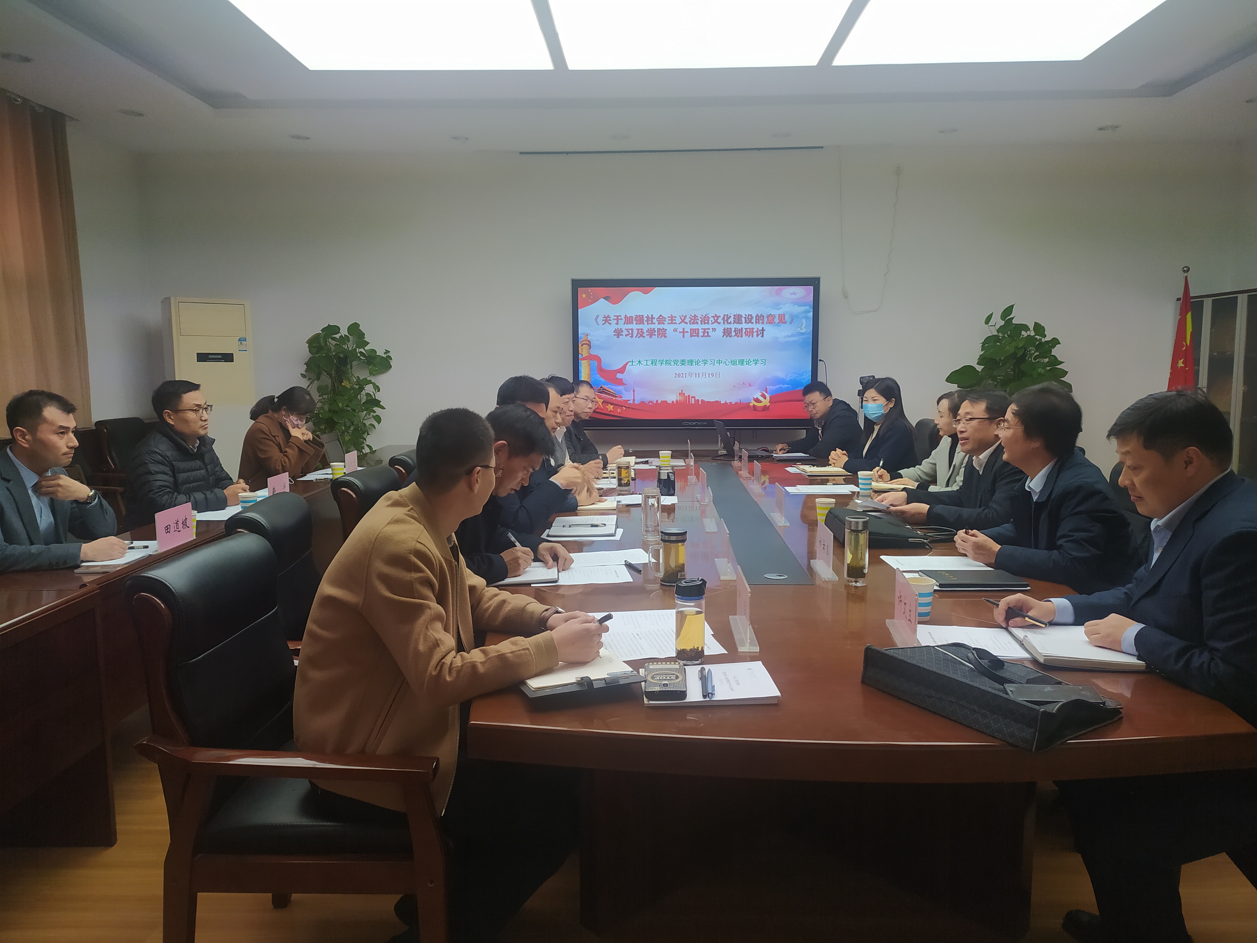 会上,刘希亮介绍了院党委中心组理论学习的前期准备和日常开展情况,院长丁亚红汇报了学院“十四五”规划制定情况,党政办主任朱运华领学了《关于加强社会主义法治文化建设的意见》。党委理论学习中心组成员结合学习贯彻习近平总书记“七一”重要讲话精神、党的十九届六中全会精神情况,依据学习内容,联系工作实际进行了研讨发言。