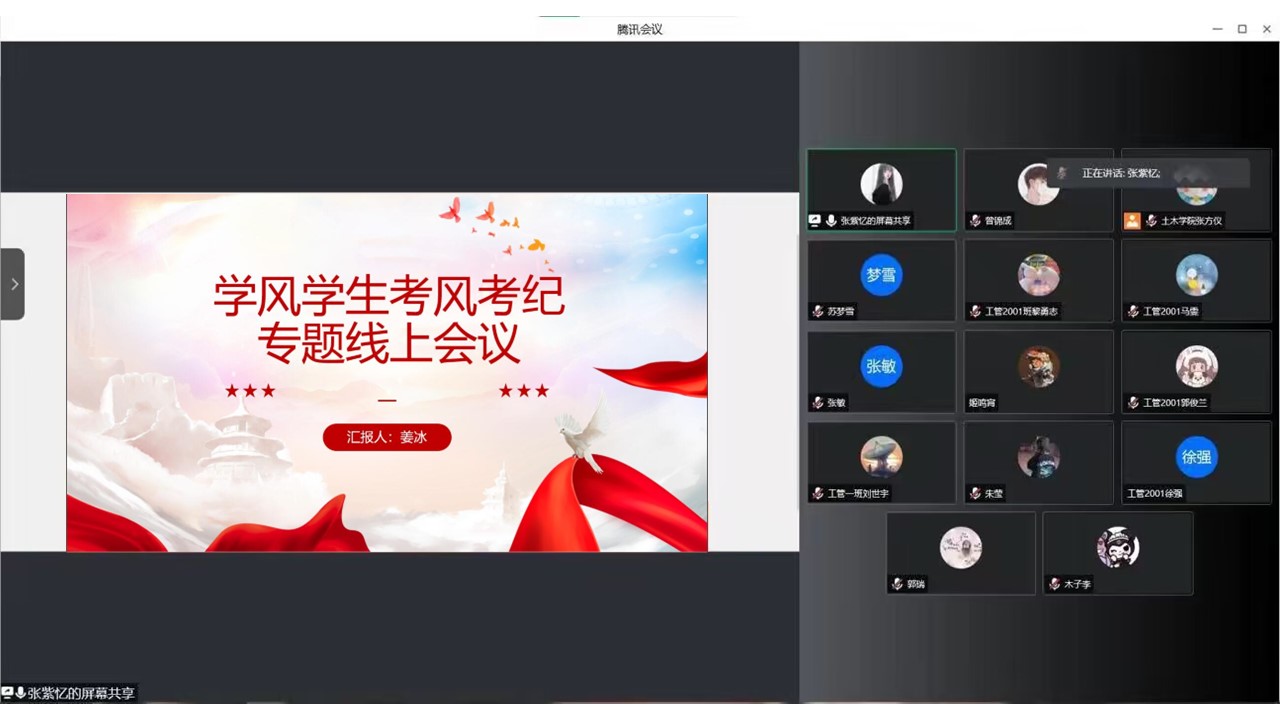 非学无以广才,非志无以成学。为了进一步建设优良学风,营造浓厚的学习氛围,引导学生树立诚信考试意识,11月10日晚,我院20级辅导员姜冰在线上进行考风考纪专题教育会议。