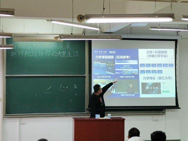 最后,李延眭同学向同学们分享了力学学习资源和学习方法,例如在中国大学慕课平台上观看力学专业课程视频、积极借阅《院士谈力学》、《力学史》等书籍、勇于参加各类竞赛来考察自我、提升自我等,并对新生表达了热烈的期望,即永远上进着,永远梦想着,永远热爱着,从现在开始,要着手去做,而不只是想想,感动自我。