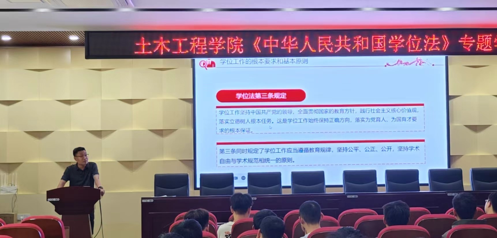 5月9日下午,学院在一楼学术报告厅对全体研究生开展了《中华人民共和国学位法》专题学习培训。土木工程学院副院长赵宇参加培训会。会议由研究生辅导员赵宁宁主持。