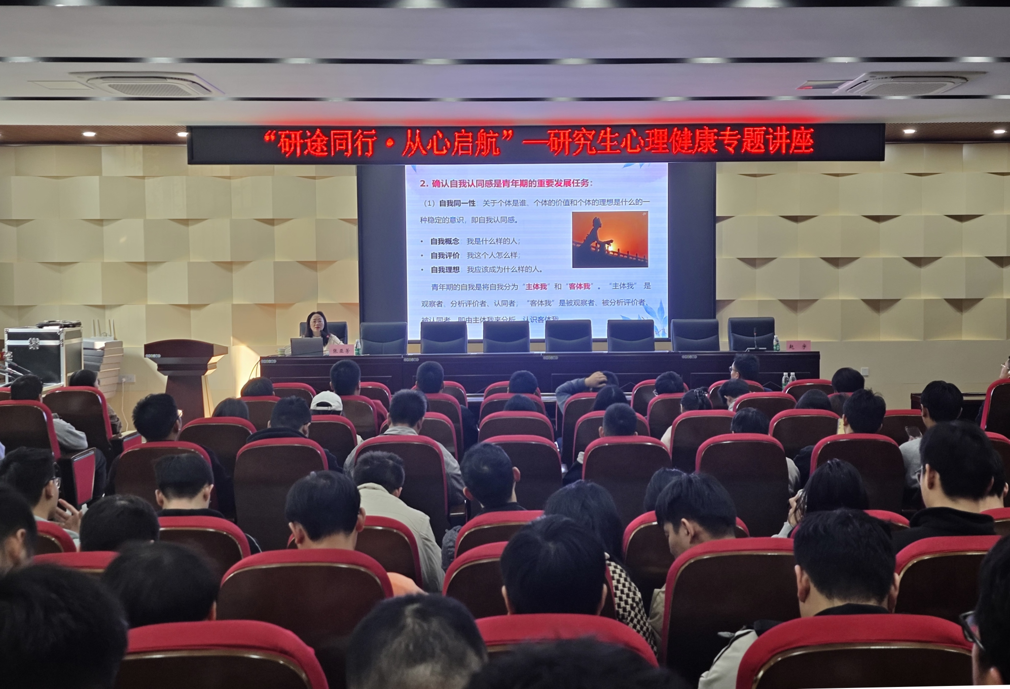 张亚芳围绕从“心理学和心理咨询简介”、“抑郁症知识科普”、“学习心理学的意义”等三个方面进行深入讲解。她凭借丰富的专业知识和实践经验,通过生动的案例和深入浅出的讲解,让同学们对心理健康有了更全面、更深刻的认识。她重点分析了研究生心理问题产生的原因,并针对问题,提出了一系列有效的应对策略。讲座过程中,张亚芳现场示范了简单有效的情绪调节方法,如深呼吸、放松训练等,同学们纷纷跟着练习,现场气氛活跃。
