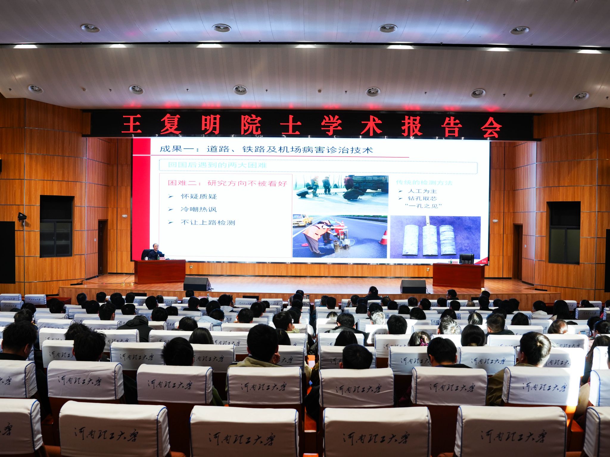报告中,王复明院士深情回顾了“75.8”特大洪水灾害激发自己投身水利事业的梦想起源,分享了他在水利工程领域的求学之路以及立志成为“工程医生”的成长历程。他详细讲述了自己带领团队多年来的研究成果,包括道路、铁路、机场等工程建设的灾害诊治防治,堤坝及地下工程渗漏治理,以及地下管道非开挖修复等领域的突破性成果。通过一系列经典工程案例生动展现了科研道路的艰难曲折,用实际行动诠释了科学家的责任感与使命感。随后他分享了在产科教融合共享平台——“坝道工程医院”上进行的探索与实践,以及对新时代工程人才培养的思考。该平台是打破行业学科界限,集成现代信息技术,搭建了涵盖应急抢修、探测监测等多个模块的多层次网络化平台,并通过政校企深度合作建设了大规模、真场景的科教融合试验基地,为推动工程科技创新、社会需求服务和人才培养提供了强有力的支撑。最后,王复明院士展望了“坝道工程医院”未来的工作重点,即致力于打造一流科技创新联合体,加快科技成果转化推广。整场报告会气氛热烈,不时响起激动的掌声。此次报告会的成功举办不仅为全校师生带来了前沿的学术知识,更为推动行业技术进步和社会发展提供了宝贵的思想启迪和实践指导。