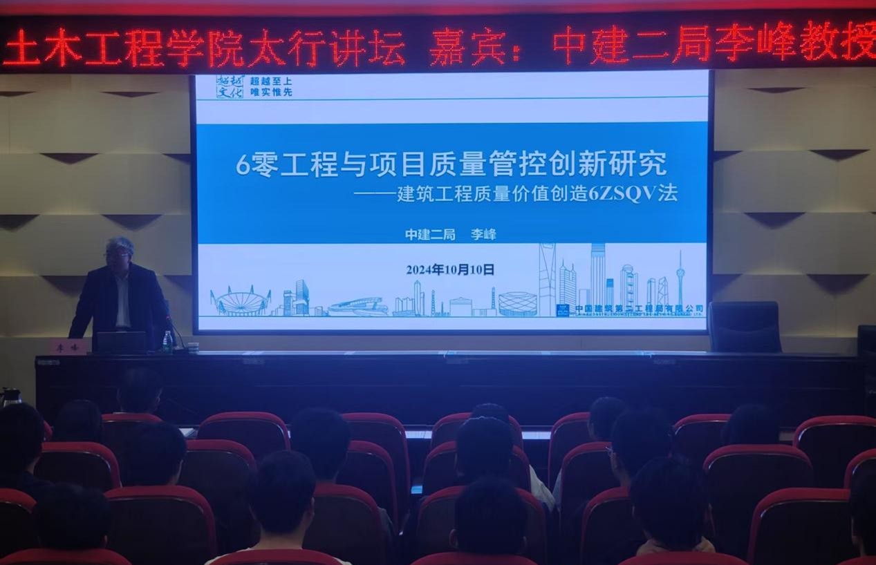 3月26日,中国建筑第二工程局有限公司李峰正高级工程师应邀在学院一楼报告厅为我院师生作《黄6零工程与项目质量管控创新研究——建筑工程质量价值创造6ZSQV法》专题报告。报告会由院长钱辉教授主持,学院部分师生参会。