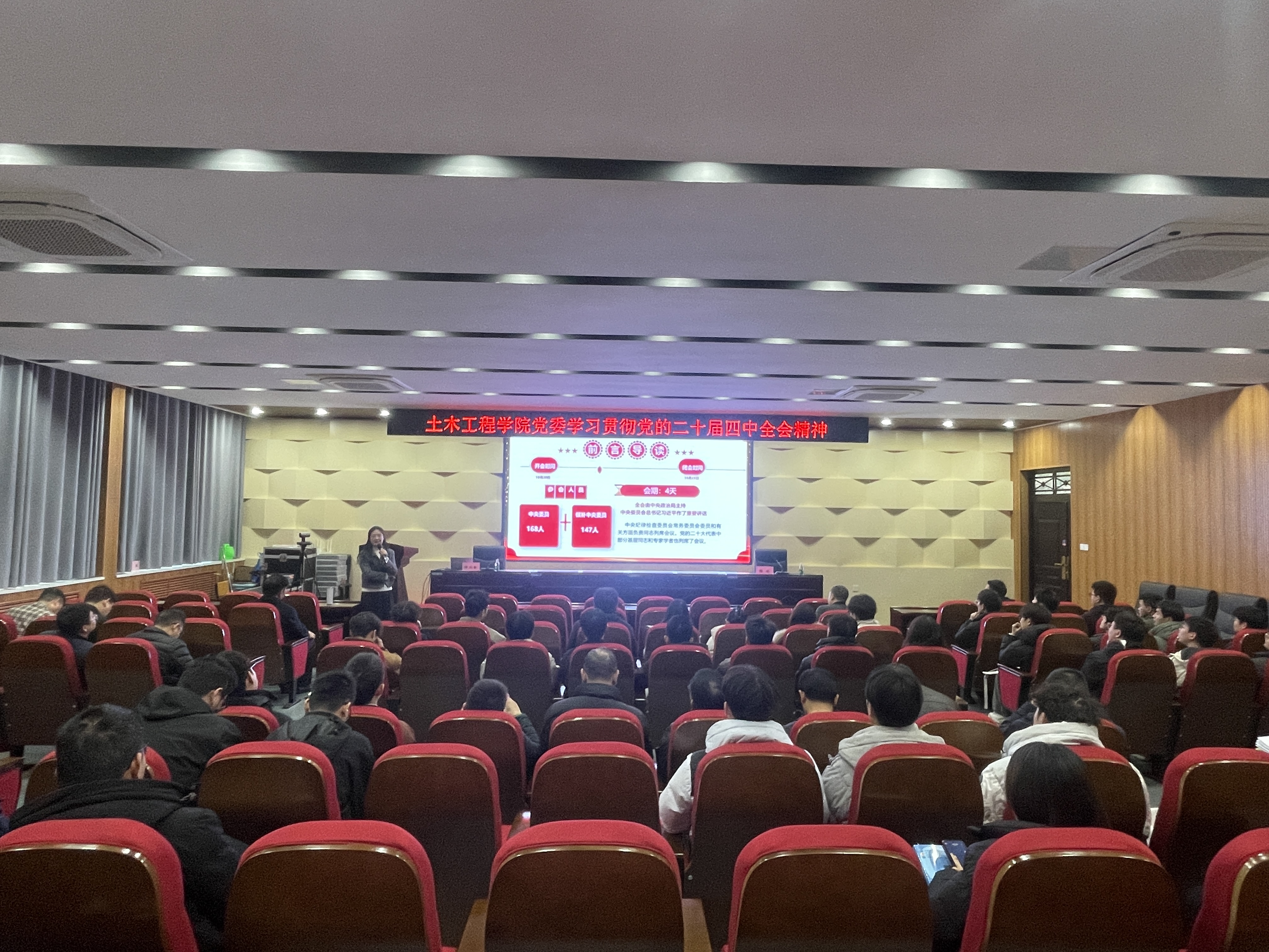 为深入学习贯彻党的二十届四中全会精神,把全院师生思想和行动统一到习近平总书记重要讲话精神及全会决策部署上来,11月19日下午,土木学院在101会议室举行学习贯彻党的二十届四中全会精神宣讲报告会。学校理论宣讲团专家任欣云老师受邀作主题报告,学院全体教职工及学生党员代表共计150余人参会学习。