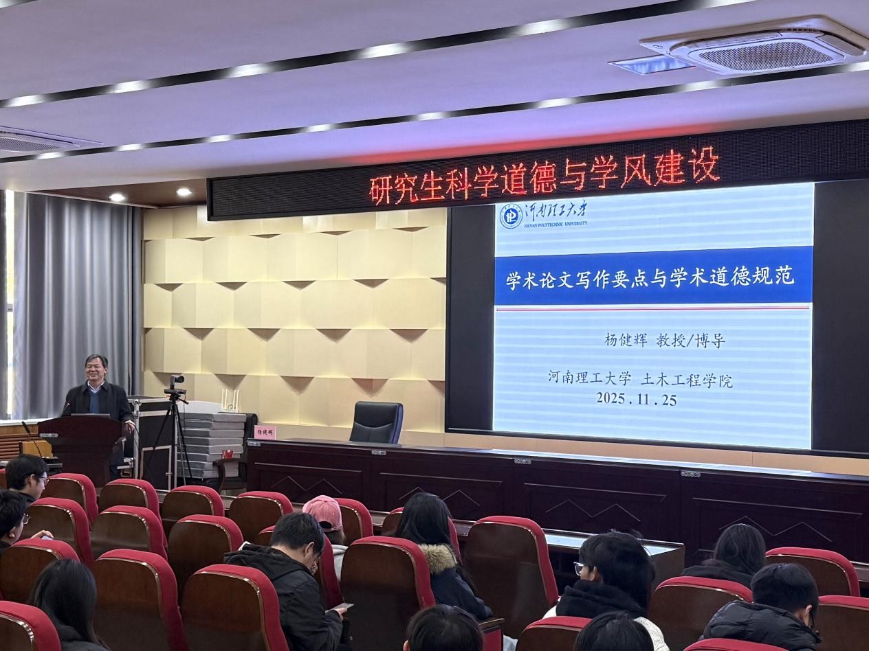 2025年11月25日下午,河南理工大学土木工程学院杨健辉教授在土木学院101会议室开展“学术论文写作与学术道德规范”专题讲座。本次讲座旨在提升研究生学术素养,规范研究行为,全院研究生到场聆听。