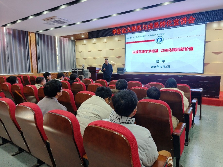 为强化研究生学术诚信意识、规范学位论文写作流程,12月3日,我院面向研究生三年级学生召开“学位论文规范与成果转化”专项宣讲会,学院副院长赵宇担任主讲,为即将进入毕业论文收尾阶段的学子们厘清规范要点、明确成果转化方向。