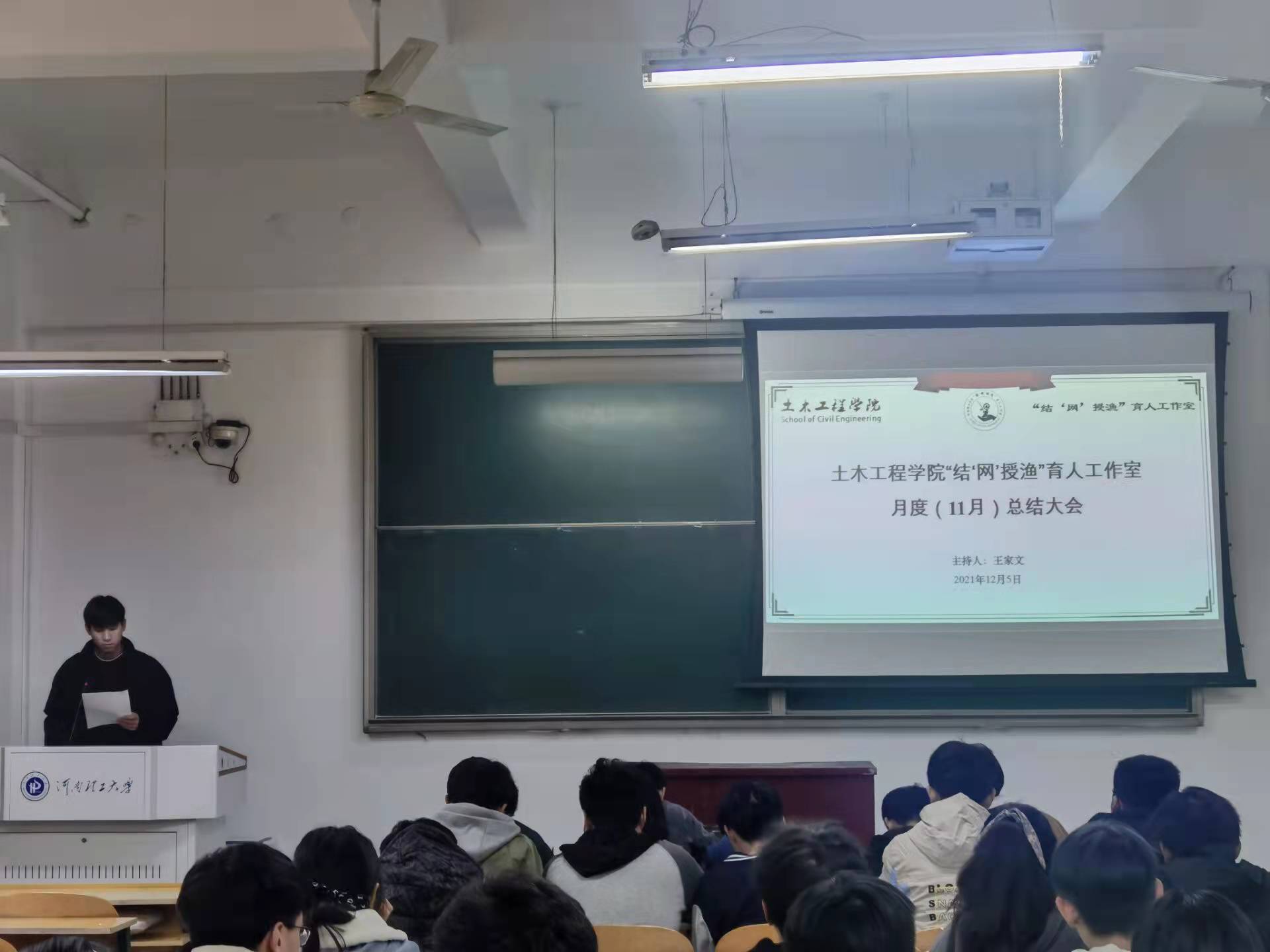 12月5日下午,土木工程学院“结‘网’授渔”育人工作室于土木学院103教室召开了十一月份月度工作总结表彰大会。本次大会由队伍评价组副组长王家文主持,“结‘网’授渔”育人工作室副主任刘竞宇、朱祖龙、主任助理李双峰到场发言,工作室全体学生干部参加。