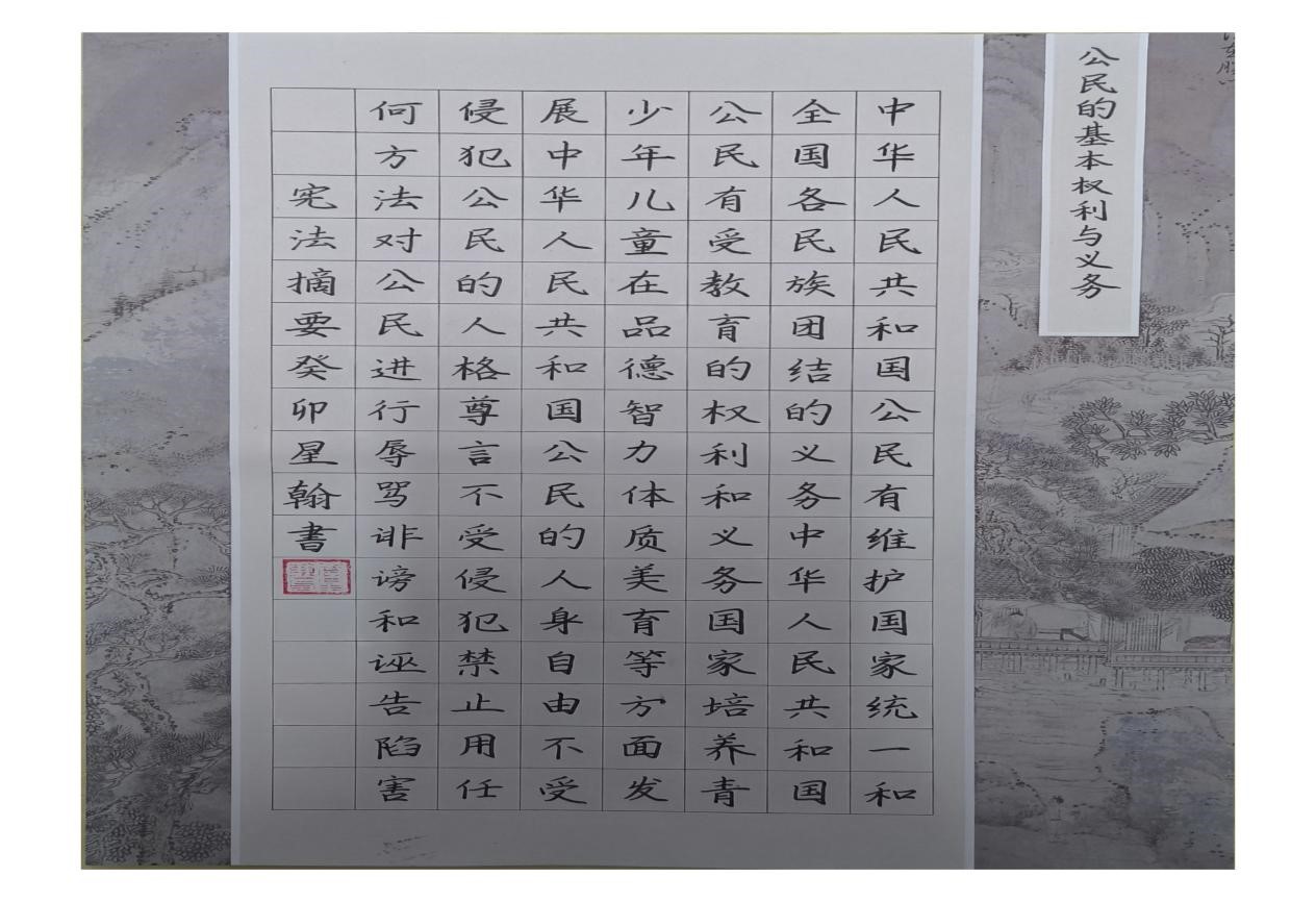本次比赛分为软笔和硬笔两个类别。参赛选手通过字体的布局、墨色的深浅及笔画的粗细,将法治精神和书法艺术完美结合,以独特的艺术表达方式展现了对宪法的理解和对法治价值观的认同。每一幅作品都展示了宪法精神的崇高力量,笔墨间透露出对法律弥坚初心的坚定追求。这些作品生动地展示了我院学生热爱宪法、尊崇宪法、维护宪法的信念和决心。经过认真梳理和评比,最终从24幅作品中精选出6幅获奖作品,彰显了选手们的才华和艺术修养。