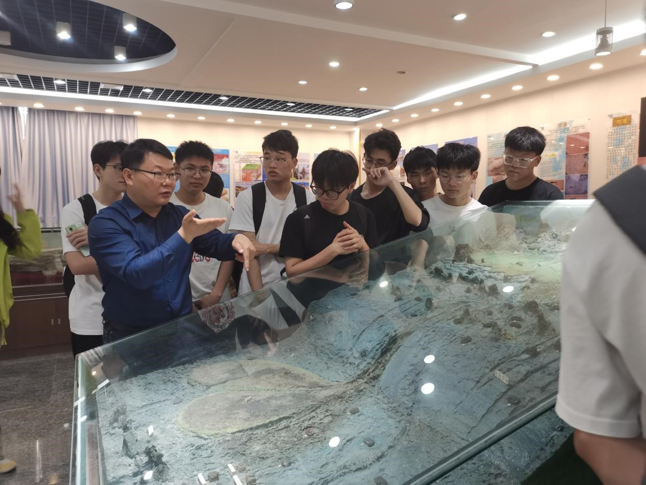 在资环学院地球科学馆的首站,郑德顺教授就地球演变史、生物进化史为大家进行了介绍,并带领大家对馆内所藏化石、矿物岩石等进行了细致观赏与讲解。在郑教授细致严谨的介绍与妙趣横生的讲授中,同学们对历史年代久远、科研价值深厚的展品进行了观察与讨论。随后,郑教授围绕岩浆岩、沉积岩、变质岩三大岩石类型,以校园内建筑和景观石材为实例进行了“研学讲解”。在资环学院门前片麻岩处,郑教授详细介绍了其深浅相间颜色的形成机理;在能源学院门前麒麟石雕处,参与学生就其表面鲕粒成因和特点进行了提问交流;在机械学院门前牡丹石处,郑教授就石体表面斜长石的形成与斑晶、基质的形态进行了详尽细致的讲解;在图书馆和明德楼的大理岩与花岗岩前和校风校训广场的波痕石前,师生们共同对其岩石特征进行了分析与研究。在研学过程中,郑教授以石灰岩和大理岩成因为喻,向同学们进一步论述了经过“高温高压”才能更加优秀的道理。郑教授强调:“好学力行”校风在要求大家知行合一的同时,更应做到学以致用,在学习过程中不仅要学习理论,更要重视实践。郑德顺教授和秦本东教授还以“世界观——自然·人类·社会”为切入点,向同学们提出了学习中与生活上的勉励。