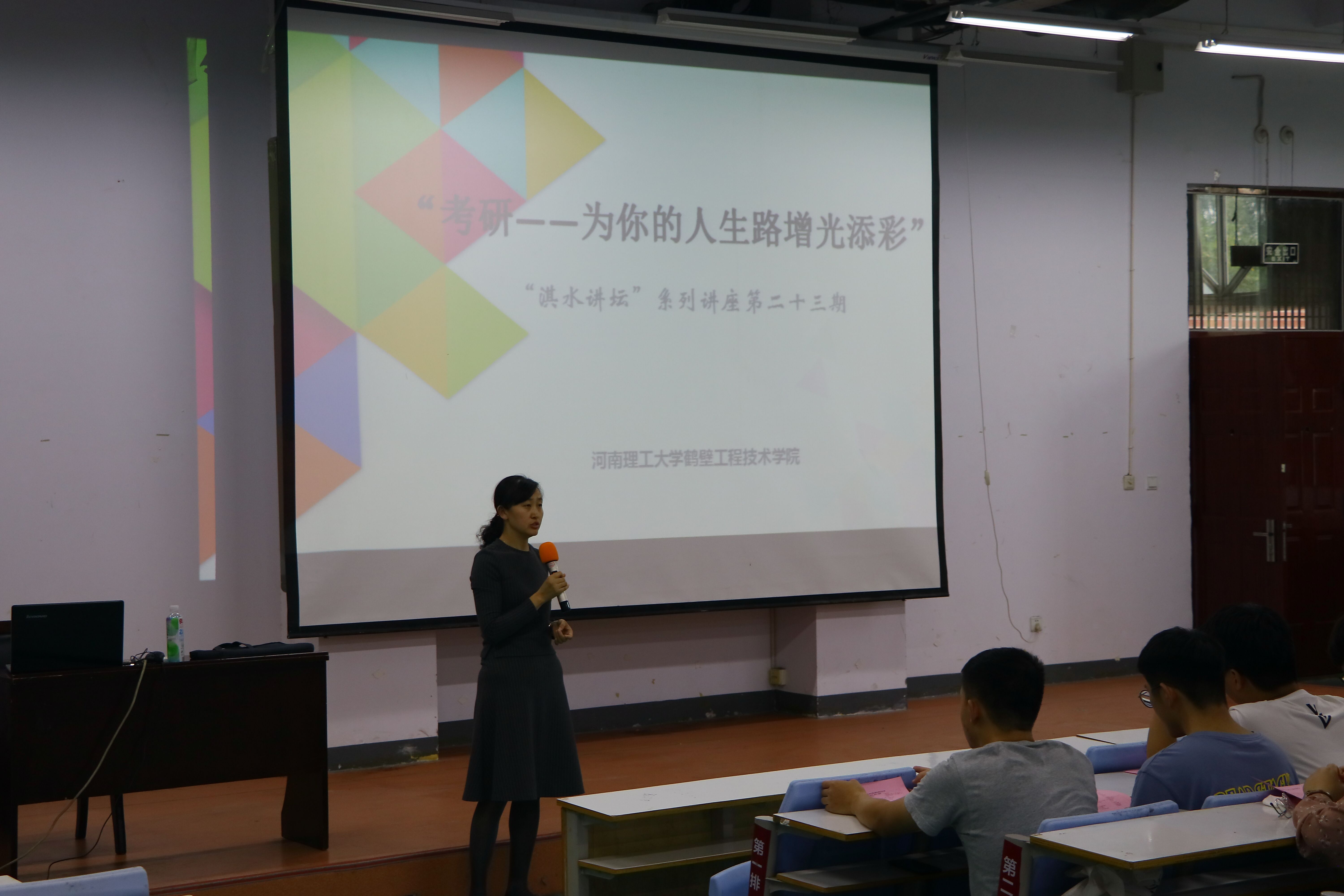 为进一步扩大我院研究生招生宣传,9月26日,范利丹老师一行3人应邀赴鹤壁工程技术学院开展“淇水讲堂系列之八——考研,为你的人生路增光添彩”专题报告。报告在该校樱花园校区拓新教学实训楼报告厅举行,由该校熊云山、王海霞老师主持,2016级本科生参加了报告会。
