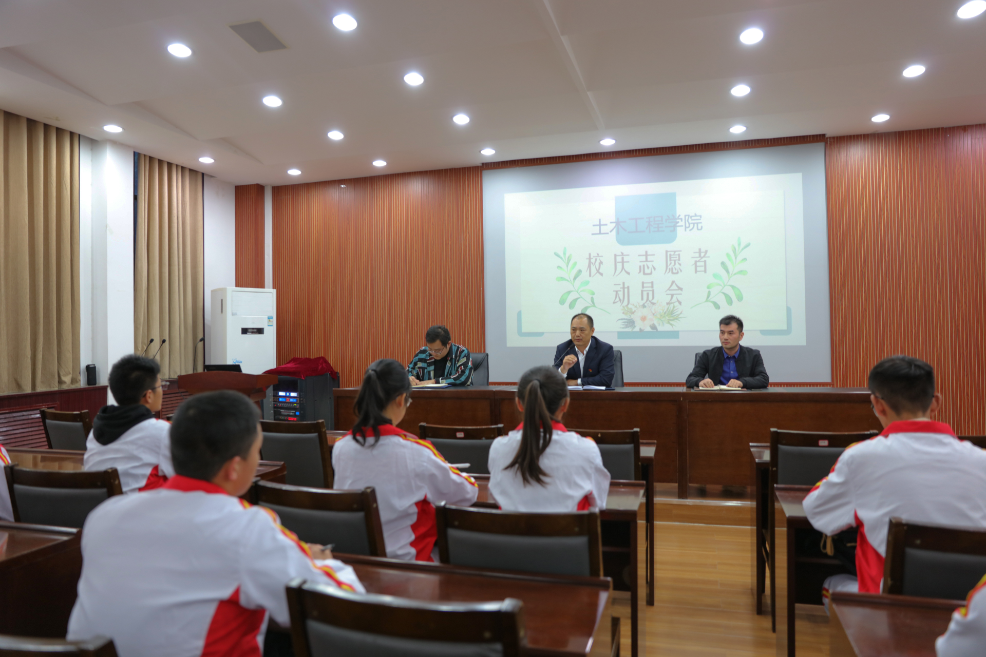 为激发我院校庆志愿者的工作激情和责任心,使他们能够在校庆期间为广大校友提供良好的志愿服务,同时向广大校友全面展示土木学子的良好精神面貌,10月15日下午,我院于学院一楼学术报告厅召开校庆志愿者动员大会。院党委副书记尹铁军、田道坡老师出席会议。经历了层层选拔的55名校庆期间学院志愿者一同参加了会议。
