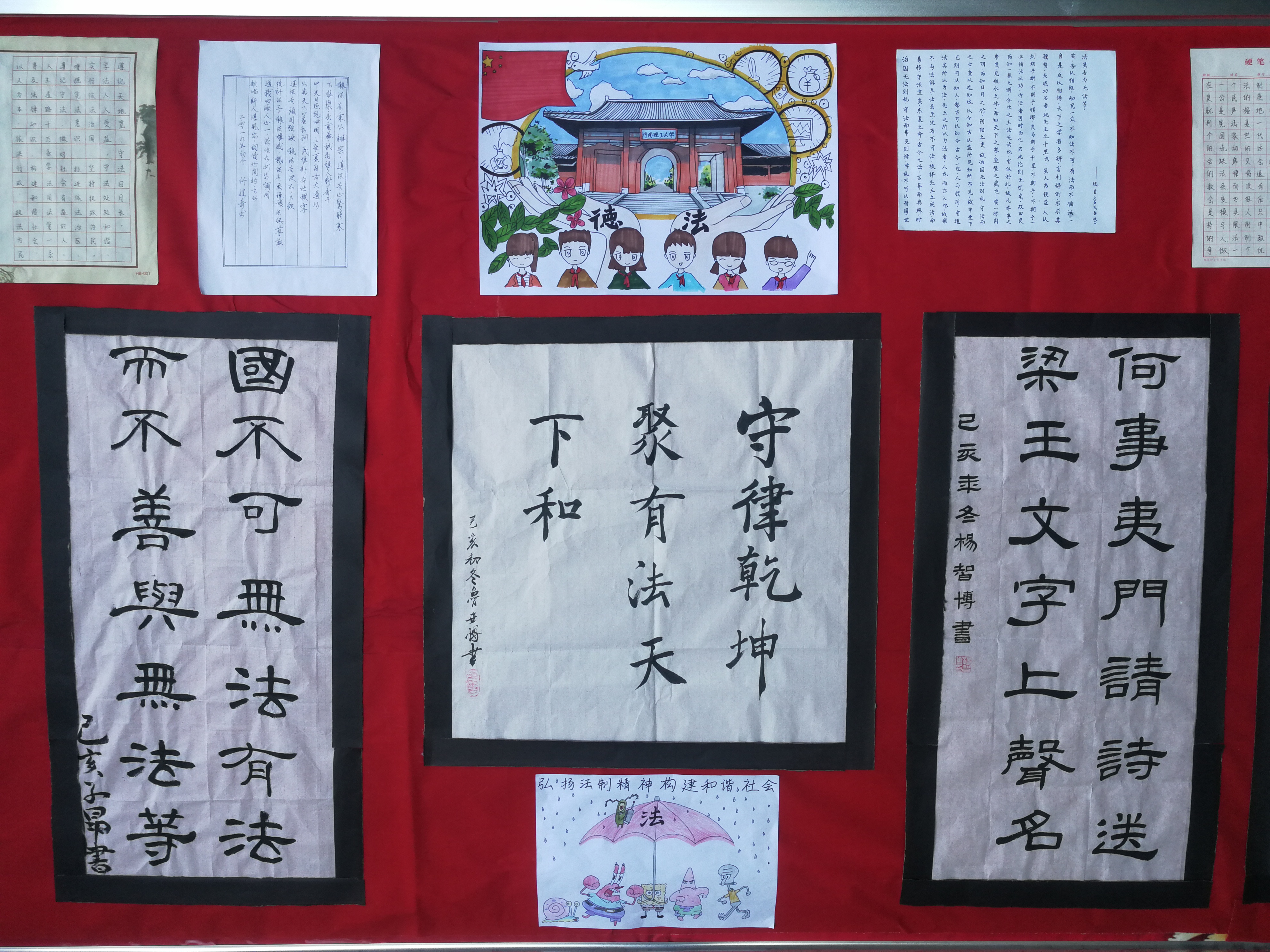 本次法治宣传教育书画摄影展是2019年法治宣传教育月的重要组成部分,经过前期的充分准备和大力宣传,学院师生踊跃参与。书法字体彰显了洒脱风骨;绘画作品展示了天马行空的思维;摄影作品蕴含了高超的摄影技巧。作品形式多样,主题鲜明,内容丰富,涵盖了法制校园、法制社会、法制家园等多方面内容,体现了我院师生对新时代法制精神的充分理解,表现了对中国特色社会主义法制建设的深刻认识。作品征集结束后,经过严格筛选,选出18幅优秀作品于学院门口进行公开展示,并对表现优秀者提出表彰,发放荣誉了证书。