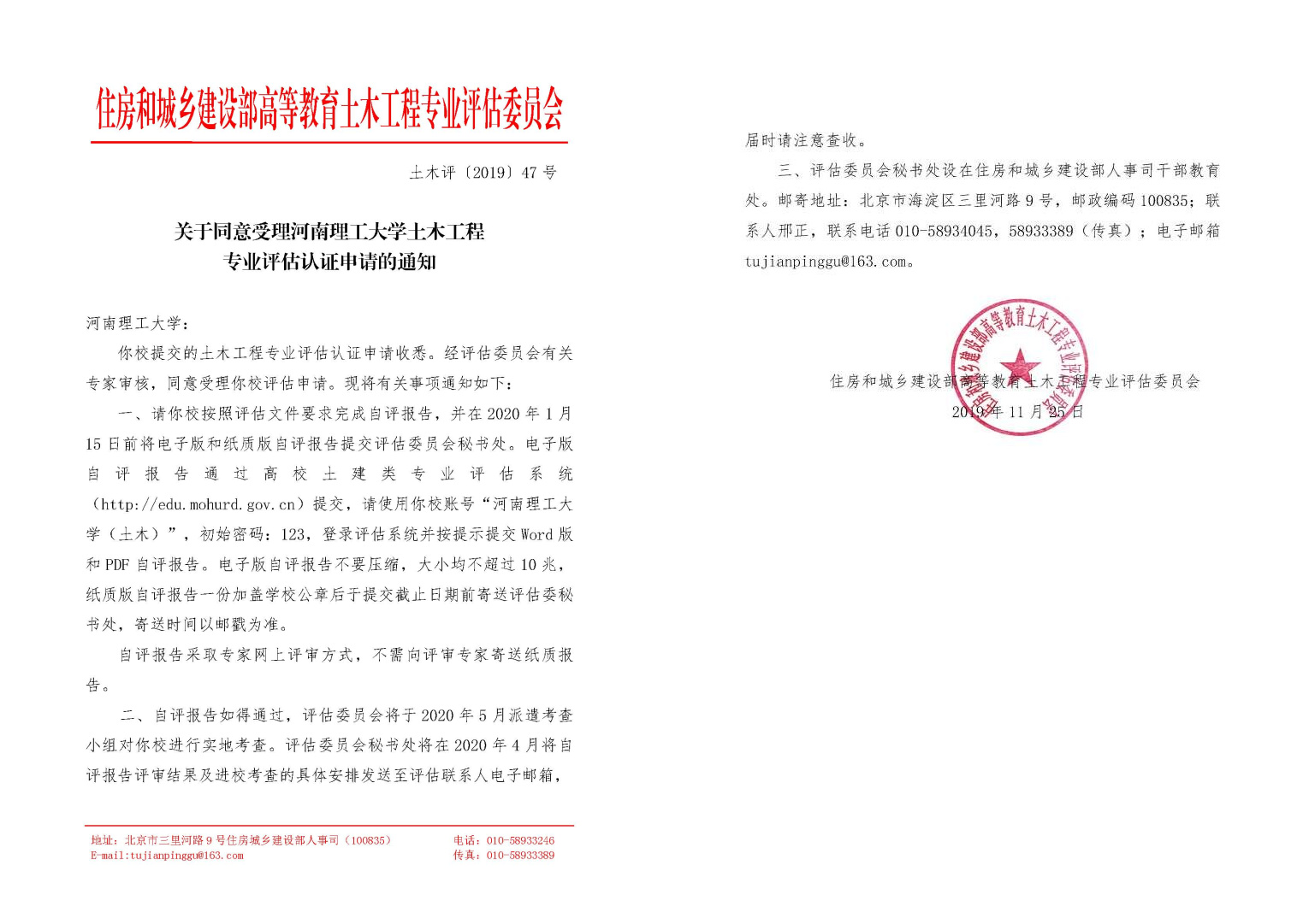 2019年11月25日,住房和城乡建设部高等教育土木工程专业评估委员会下发《关于同意受理河南理工大学土木工程专业评估认证申请的通知》(土木评[2019]47号),我院申请2020年专业评估认证的土木工程专业获受理。