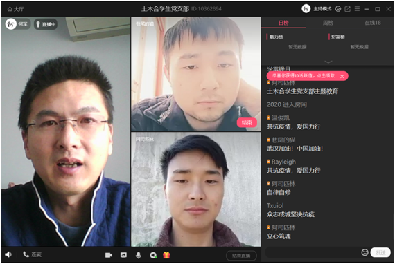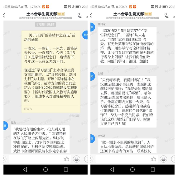 中午,土木合学生党支部借助支部工作QQ群的群视频功能,以直播形式召开支部大会,何军作为主播角色,讲述了雷锋的人生经历和先进事迹,剖析了雷锋精神的时代内涵和具体内容。支部成员纷纷连麦,发表感想,组织委员肖磊说道,我们要认真学习《新时代公民道德建设实施纲要》,要弘扬雷锋精神和奉献、友爱、互助、进步的志愿精神。宣传委员戴鑫谈到,疫情当下,今年的这一天显得尤为不同,在这场战“疫”中,涌现出无数凡人英雄,以血肉之躯抗击疫魔,践行雷锋精神,我们要向他们学习看齐。为让更多党员同志能够表述见解,当日下午,支部通“学习强国”平台上的“土木合学生党支部组织群”发布了“雷锋精神之我见”活动通知,党员纷纷以文字的形式表达了自己对雷锋精神的认知。