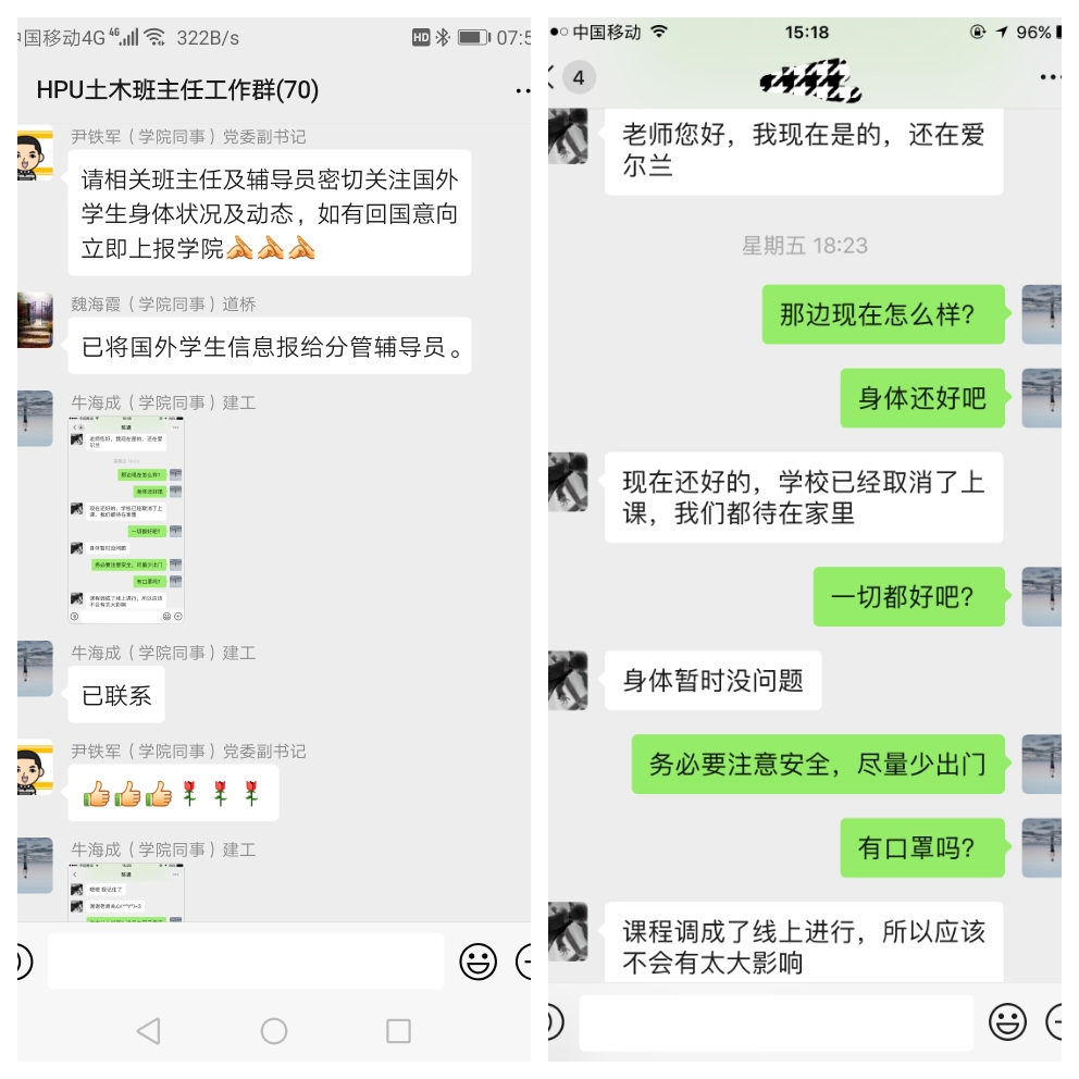 国内新冠肺炎疫情目前形势有所好转,但其他国家疫情形势日趋严峻,我院多举措关爱海外交流学习的9名学生,用温情抗击疫情。 我院现有9名学生在海外交流学习,其中,1名在德国读预科,8名在爱尔兰参加合作办学项目,目前在海外一切安全。新冠肺炎疫情发生后,辅导员不忘师者初心、守土有责,一对一联系在海外学习的学生,掌握每一位学生的动态,引导学生服从属地防控管理,加强自我防护,有异常情况及时就医并向学校报告。近日,学院实施海外学生网格化管理,构建9名学生的小单元网格化管理体系,建立工作台账,辅导员、班主任纷纷通过电话、邮件、微信等各种线上渠道,传递新冠肺炎的防控知识和国内抗“疫”的成功经验、有效做法,叮嘱他们认真做好自我防护,以乐观的精神和饱满的斗志战胜目前的困难,学校始终是他们坚强的后盾。学生们纷纷表示感谢学校、学院一直以来对他们的关心和爱护,在这特殊时期一定会保护好自己,学成归来,报效祖国。 |