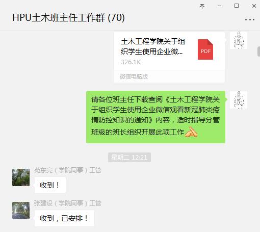 为扎实做好2020年春季学期学生返校工作,切实保障学生身体健康和生命安全,我院学生工作办公室联袂“结‘网’授渔”育人工作室,组织全院2800余名学生利用周二下午政治理论学习时间,使用企业微信观看新冠肺炎疫情防控知识视频。