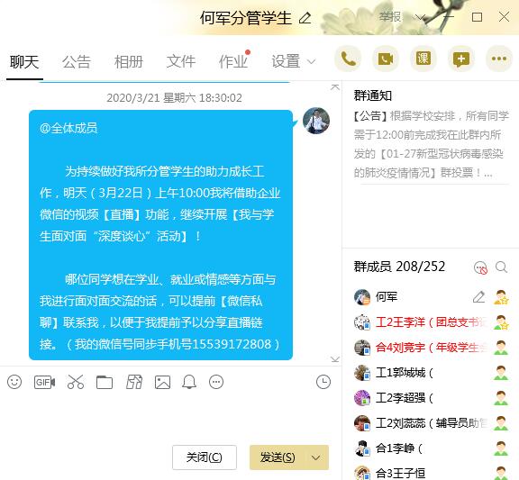 3月22日上午,我院辅导员何军借助企业微信的视频直播功能,线上开展与学生面对面“深度谈心”活动,给学生在疫情期间注入了为新时代奋斗的精神力量,近20名学生及家长参与其中。