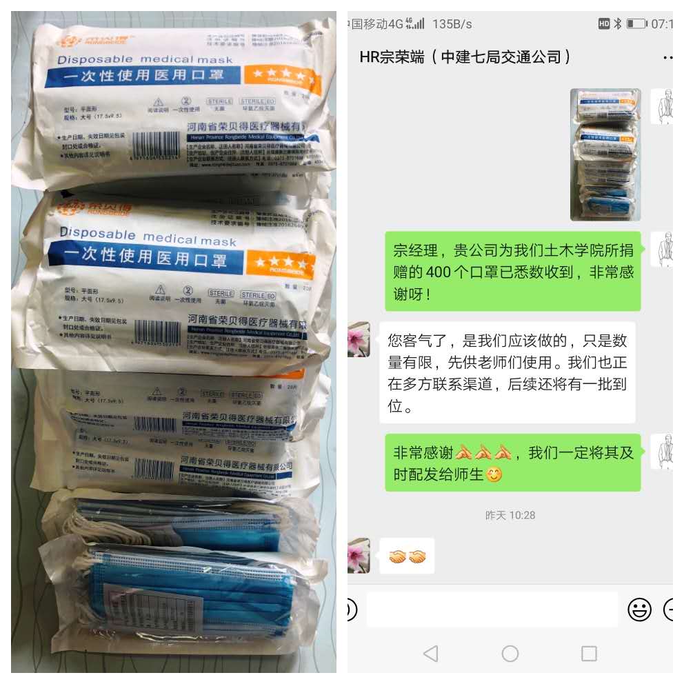 疫情无情人有情,400只口罩温暖了校园,感动着师生。中建七局交通公司为我院师生顺利返校提供有力的医疗物资保障,彰显了抗击疫情的大爱壮举和担当作为,校企携手并进,共同守护师生的身体健康和生命安全。