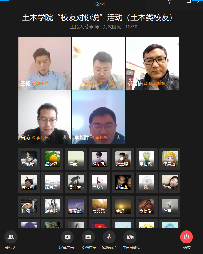 为凝聚朋辈力量服务引导学生,4月19日上午,我院开展“云”端“校友对你说”活动,助力青年学生深入了解专业道路、认知专业发展方向,活动由学工办发起,近150名学生参与其中。 根据我校学籍管理相关规定,我院将于本学期末开展土木大类招生学生的分专业工作,为使在读学生进一步认知专业方向、明晰专业道路,该院学工办特邀包含土木类相关专业、方向的5位优秀校友开展“云”端“校友对你说”活动。活动伊始,学工办教师何军逐一介绍了参与活动的优秀校友,提示在读一年级学生需结合自身情况进行专业方向的选取。随后,由从业于河南神火建筑安装工程有限公司的2007级土木专业道桥方向校友高涛、从业于中南建设集团股份有限公司的2007级土木专业岩土方向校友郭杰、从业于中国化学工程第十四建设有限公司的2008级土木专业建工方向校友李长胜、从业于郑州航空港区市政建设环保局的2012级地下专业校友王畅和正在攻读西安建筑科技大学博士研究生的2012级建环专业校友郭晋楠结合大学期间所学专业、方向,分别就自身毕业后的国内外从业经历、创业经验、升学感悟、从政体会等,为“小石臼”们客观分析了土木类相关专业、方向的未来前景及取舍之处,逐一解答了学生们所提出的困惑,加深了在读学生对专业的合理认知。据悉,日后学工办将开展“校友对你说”的一对一人物专访活动,进一步深化“校友对你说”活动实效。 |