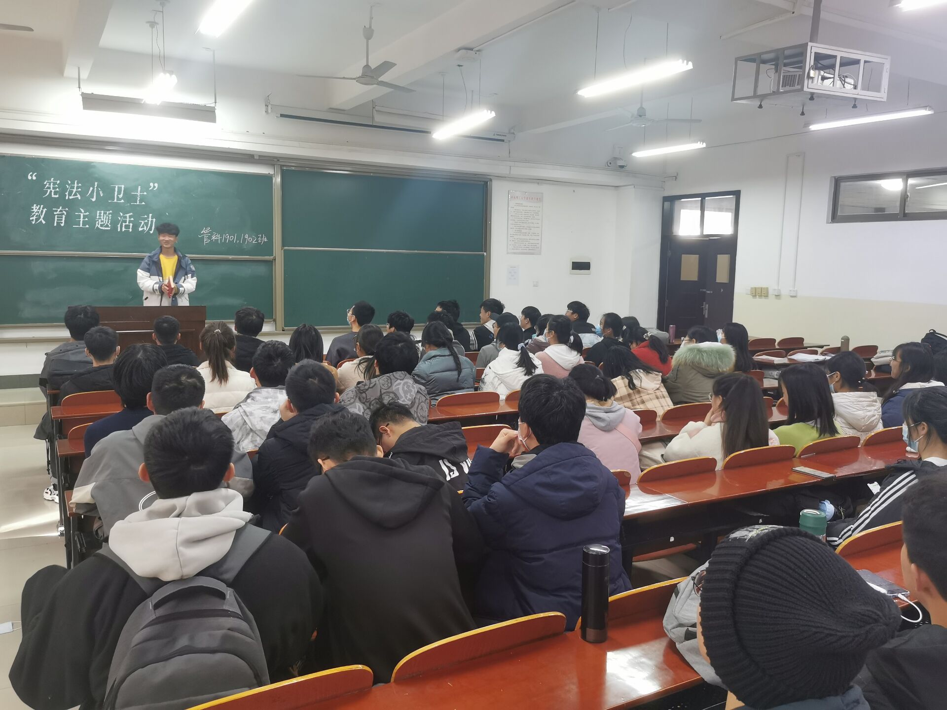 2019年10月29日,为大力弘扬法制精神,响应“法治进校园”活动,管理科学专业19级全体学生举办“宪法小卫士”教育主题活动,活动由1班和2班班长带领于文综楼举办,包括学习宪法基本知识,全体起立宣誓,依次分享宪法手抄报。