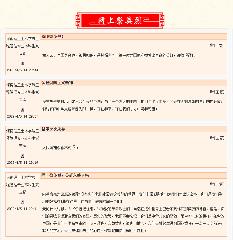 一年一清明,一岁一相思。为继承和弘扬革命先烈的优秀品质,传承红色基因,增进爱国情怀,引领支部党员缅怀革命先烈,铭记历史,不忘初心、牢记使命。工程管理专业学生党支部于4月5日开展“清明节——网上祭英烈”主题党日活动。