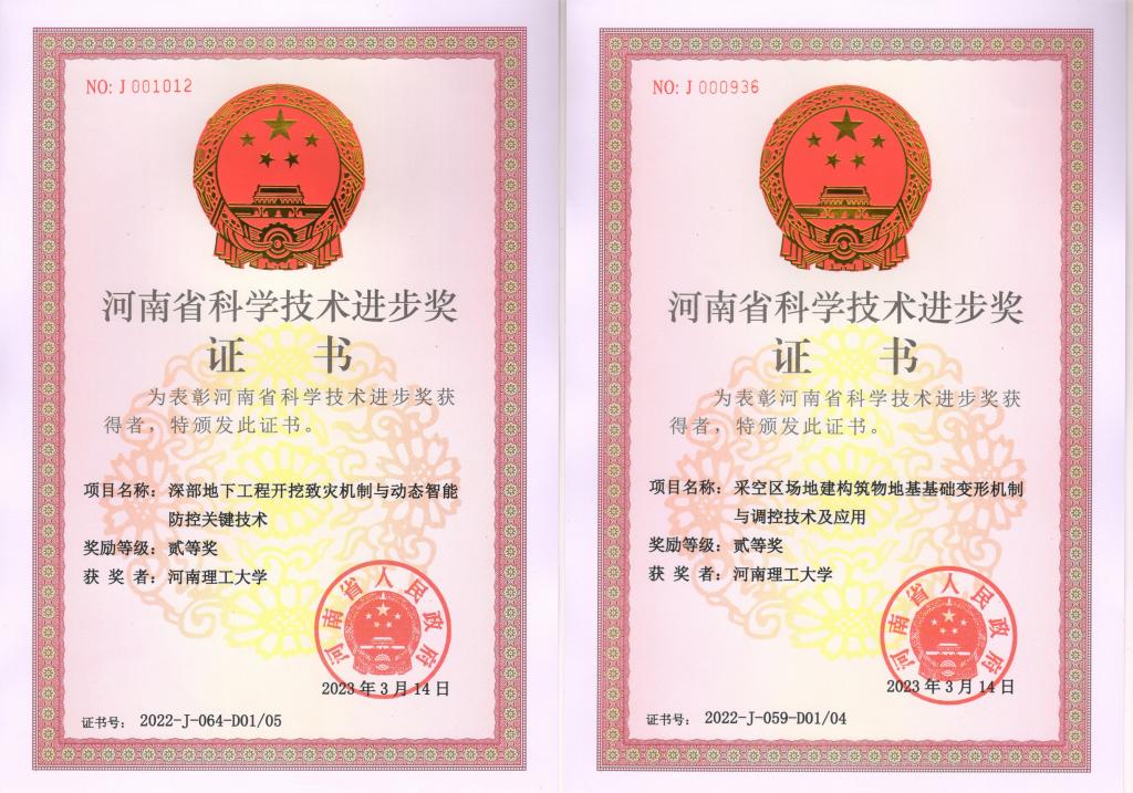 由我院牵头,山东理工大学等五单位共同完成的《深部地下工程开挖致灾机制与动态智能防控关键技术》项目,以推动深部岩体复杂力学响应认知及灾害防控技术发展为目标,在深部岩体力学响应规律与致灾机制、力学特性科学表达、工程设计与灾变控制等方面取得系列创新性成果。相关理论与技术促进了深部岩体多元信息和灾变分析的高精度、智能化、集成化,推动了我国深部地下工程防灾减灾领域的发展,项目获得2022年河南省科学技术进步二等奖。