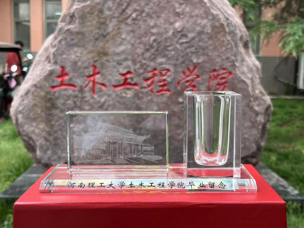 大红色的礼盒,烫金色的校徽。礼盒上方正中间篆刻着“河南理工大学土木工程学院2023届毕业生留念”字样,典雅庄重又不失美感。这座承载着土木学子大学情节的水晶笔筒由两部分组成,左侧是一面镌刻着学校大西门的水晶墙,象征着无论身处何方,母校永远是毕业生的坚强后盾,右侧是一个外方内圆的矩形笔筒,在“天圆地方”的美好寓意中象征着求实进取,书写人生新篇章。