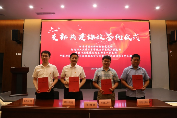 随后,四方党支部签订了支部共建协议。中建七局第一党支部书记、人力资源部经理李书玮宣读《迎七一·同心共建促发展实施方案》,提出整合各方意见,发挥各方职能,形成多元化发展的目标。河南省园林绿化协会焦作联络处常务副主任刘国利分析了焦作园林行业发展现状及人才引进情况。中建七局焦作南水北调项目党支部书记、项目经理张学庆、我院力学系党支部书记蔺海晓进行了支部建设经验分享。
