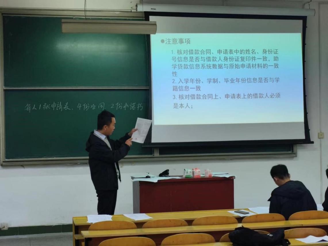 活动开始,张纪云首先对国家助学贷款的政策进行了讲解剖析,国家助学贷款是我院资助工作体系的重要内容,是实现资助,有效解决经济困难学生的一条重要途径,并以PPT的形式向大家展示了高校贷款合同签订需要注意的事项,同时教育学生要知恩感恩,诚实守信。随后,对助学贷款合同及承诺书如何签订进行了说明。贷款学生认真阅读了合同及承诺书内容,在合同及承诺书上签字并按下指印。