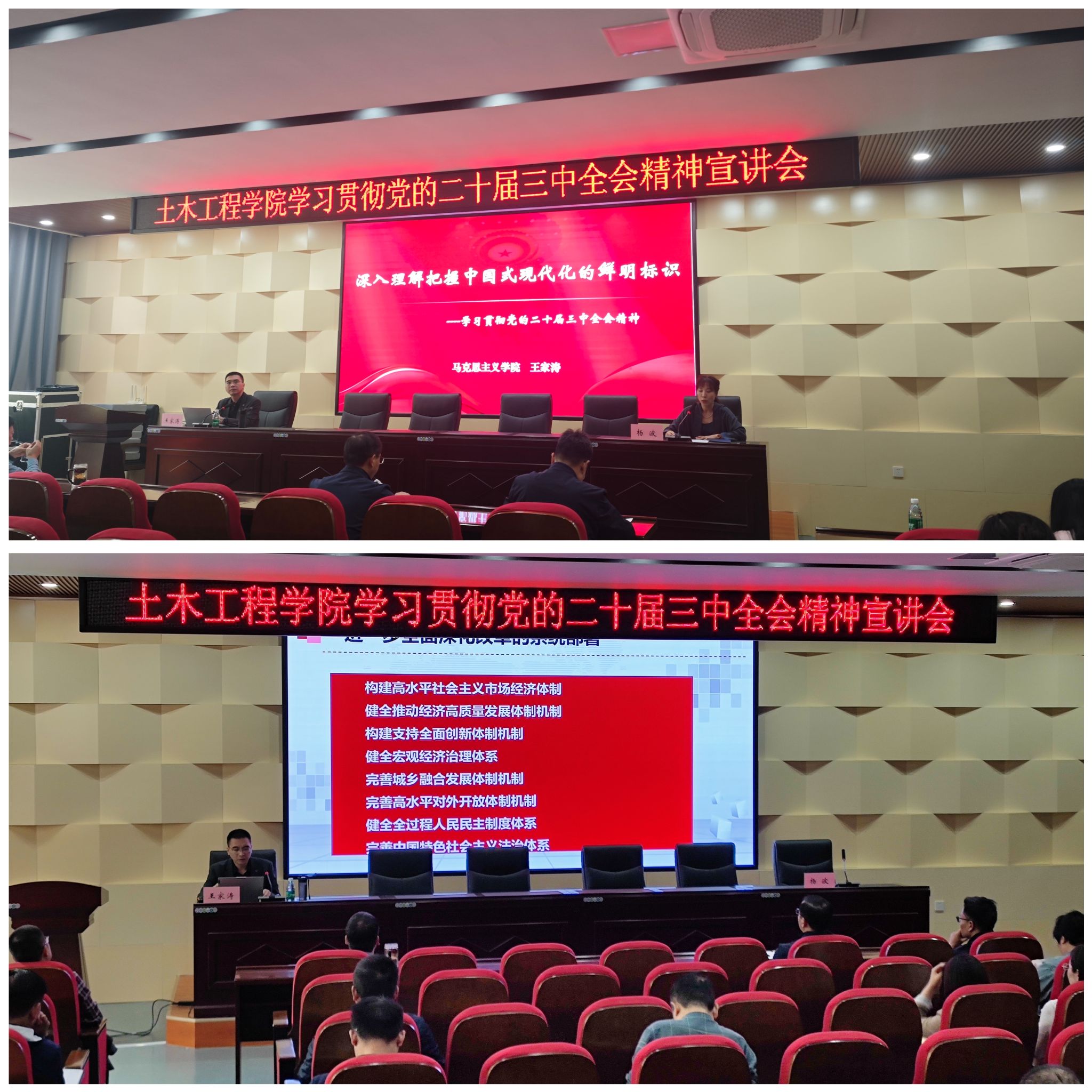 为深入学习贯彻党的二十届三中全会精神,引导学院师生把思想和行动统一到习近平总书记重要讲话和全会精神上来,10月8日下午,土木学院在学院101会议室举行学习贯彻党的二十届三中全会精神宣讲报告会,邀请学校理论宣讲团专家王家涛老师作《学习党的二十届三中全会精神 深入理解把握中国式现代化的鲜明标识》专题报告,学院全体教职工及学生党员代表共计150余人参加报告会。报告会由学院党委副书记杨波主持。