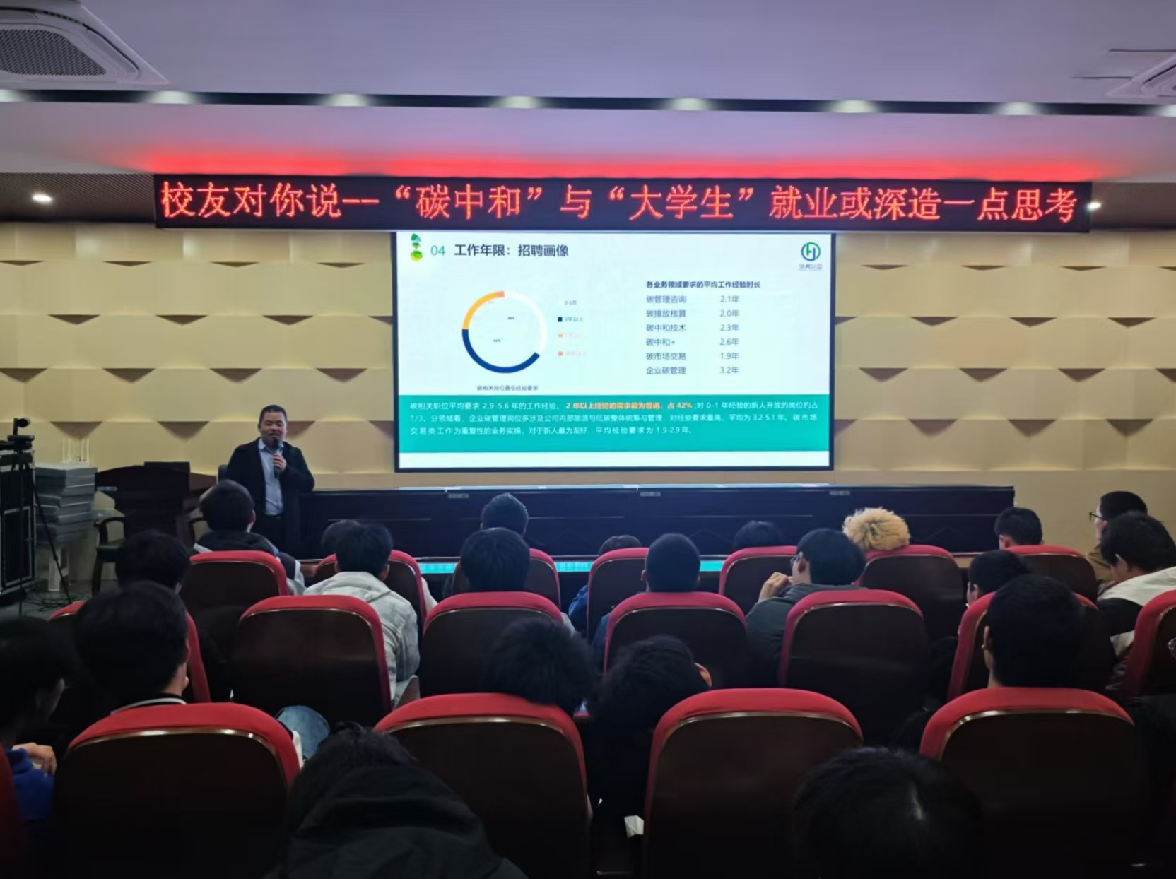 本次座谈邀请河南省发改委碳中和小组专家、学院2000级优秀校友李志国主讲,他以《'碳中和'与'大学生'就业或深造一点思考》为题,带领同学们深入了解“双碳”目标背后的科学原理、技术手段及发展前沿,引导同学们在未来职业定位、考研方向选择方面有了更深层次的思考。在现场互动环节中,他与同学们亲切交流、答疑解惑, 让“校友对你说”座谈更有温度和效度。