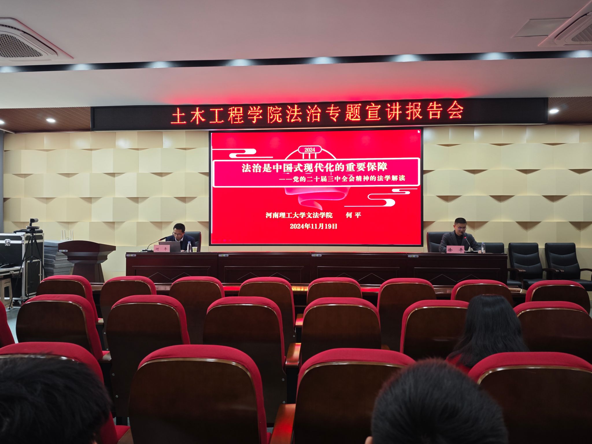 为深入学习贯彻党的二十届三中全会精神,推动学院师生深刻认识进一步全面深化改革、推进中国式现代化的重要意义,提升学院师生的法治观念,11月19日下午,我院在学院楼101会议室举办了“法治是中国式现代化的重要保障”为主题的法治宣讲报告会。本次报告会特别邀请了校理论宣讲团专家何平老师主讲。学院教师及学生代表共计120余人参加,报告会由我院副院长徐平主持。