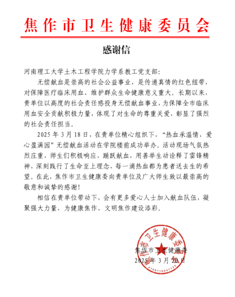 近日,土木工程学院力学系教工党支部收到来自焦作市卫生健康委的来信,信中对该支部精心组织的无偿献血活动表示了高度赞扬和衷心感谢。