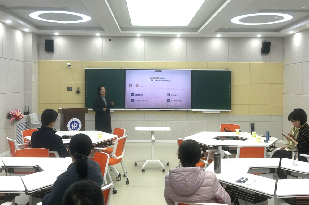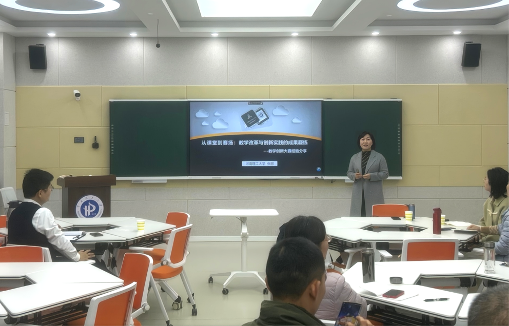 随后,我院张敏霞老师结合其在教学创新大赛和说课比赛中的实践经验,带来了一场内容丰富、富有启发性的专题报告。她以所授课程为例,围绕课程概述、教学痛点、创新思路与举措、教学成效与推广应用等方面展开深入讲解与互动交流。张老师的报告为我院教师在课程改革与教学创新方面拓展了新视野,有效促进了教师之间的经验共享与教学能力提升。