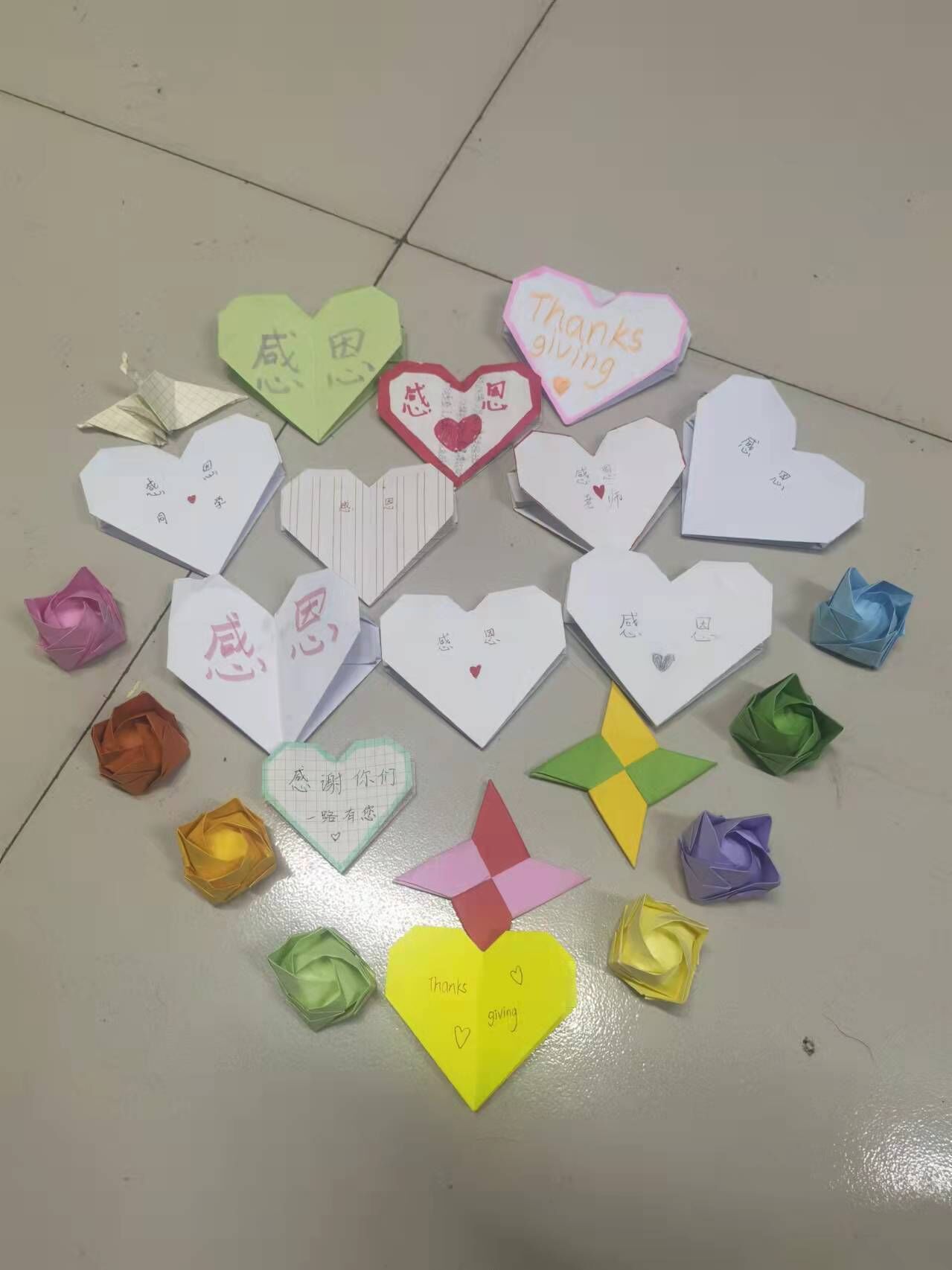 此次活动通过同学们的讲述、发问、分组讨论等形式展开,主题活动进行得如火如荼,调动了学院每一位同学的参与。活动形式多样,触及心灵,唤醒了大家的知恩、感恩、报恩的意识,使大家懂得了生命的意义,懂得了现在拥有幸福的可贵。接着,在优美音乐的烘托之下同学们满怀深情地写下自己对父母、对朋友、对周围的人与事的感恩寄语,小心翼翼地写在彩纸上,折成爱心形状,承载着同学生感恩寄语和美好祝愿的爱心不到一小时堆满了桌子。